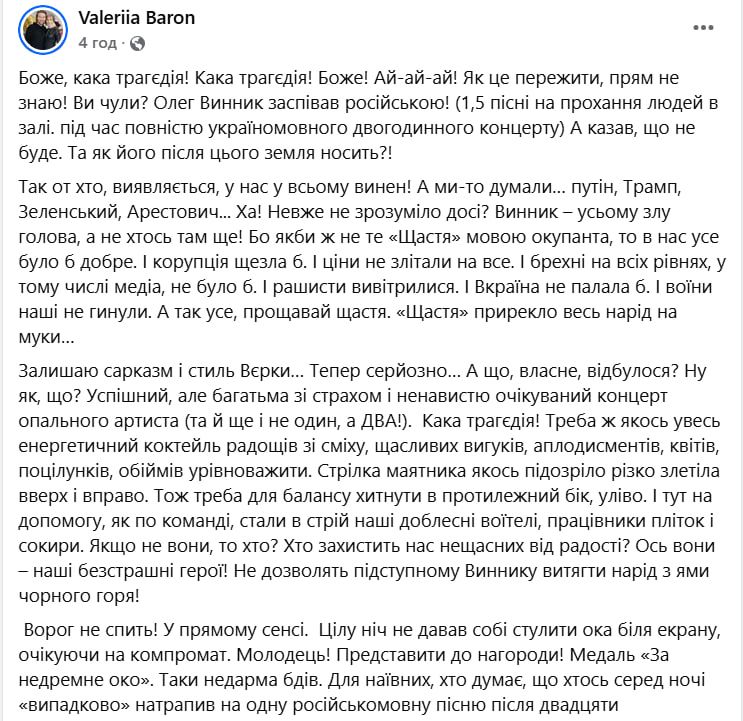 Далее она опубликовала еще один пост, правда, он был несколько более эмоциональным. В этой публикации Валерия раскритиковала тех, кто осуждает Олега Винника за песни на русском языке на концерте. Она считает, что реакция критиков, которые подают это как "трагедию" и якобы обвиняют певца во всех проблемах страны, является преувеличенной.