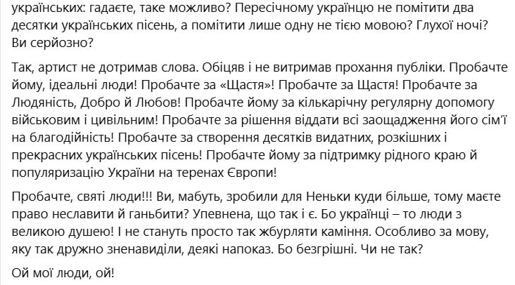Так, артист не сдержал слово. Обещал и не выдержал просьбы публики. Простите ему, идеальные люди. Простите за "Счастье". Простите за счастье! Простите за человечность, добро и любовь. Простите ему за многолетнюю регулярную помощь военным и гражданским. Простите за решение отдать все сбережения его семьи на благотворительность. Простите за создание десятков выдающихся, роскошных и прекрасных украинских песен. Простите ему за поддержку родного края и популяризацию Украины на территории Европы. Простите, святые люди. Вы, видимо, сделали для неньки куда больше, поэтому имеете право не славить и позорить? Уверена, что так и есть. Потому что украинцы – это люди с большой душой! И не станут просто так швырять камни. Особенно за язык, который так дружно возненавидели некоторые напоказ. Потому что безгрешны. Не так ли?,