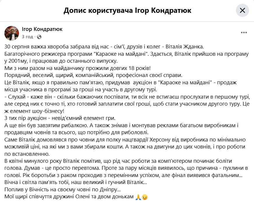 - 30 августа умер режиссер программы "Караоке на майдане" Виталий Жданок, который болел раком.