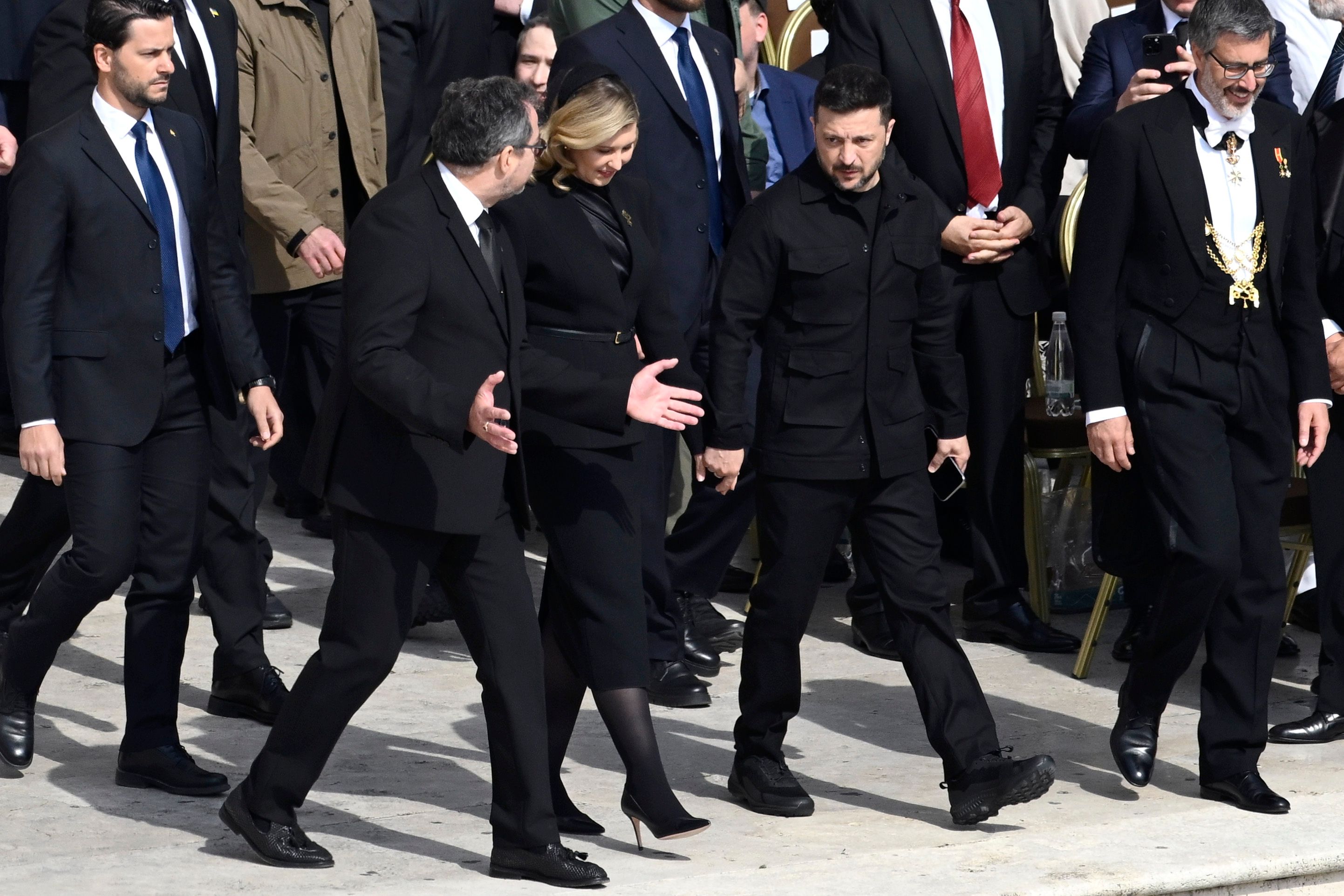 Владимир Зеленский для события также выбрал черный наряд: брюки, куртку и, вероятно, футболку. Президент Украины уже не раз подчеркивал, что будет носить костюм, когда завершится война.