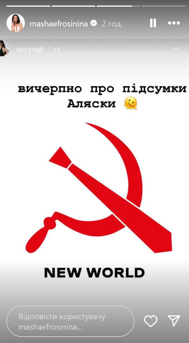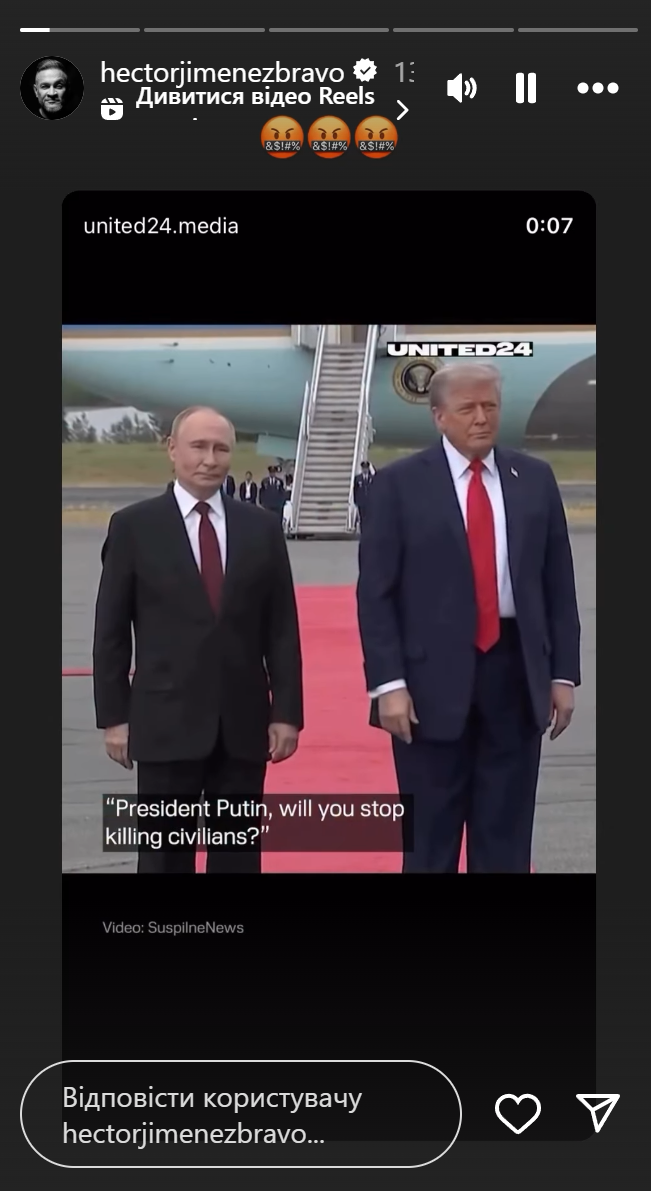 Маша Ефросинина, Евгений Кот, Эктор Хименес-Браво, Даша Квиткова и другие украинские звезды уже также отреагировали на встречу Путина и Трампа в Аляске. Они распространили об этом инстаграм-сторис.