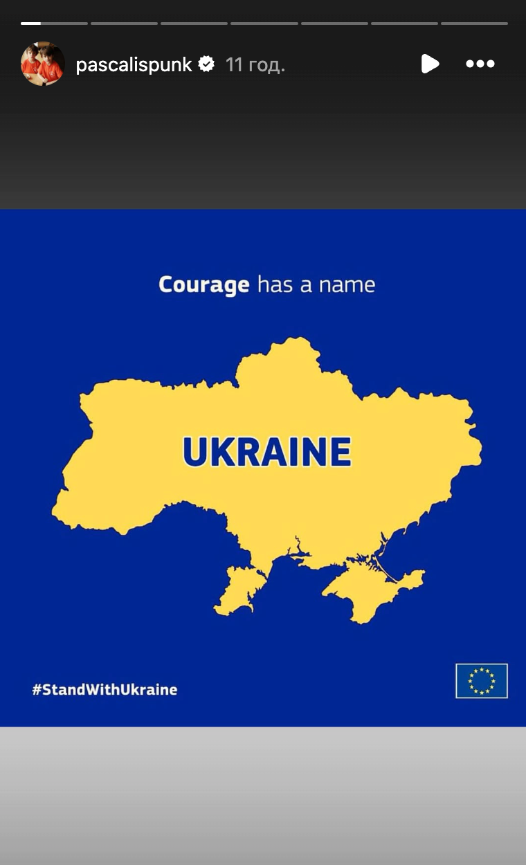Педро Паскаль, который в инстаграме имеет 8,8 миллиона подписчиков, опубликовал несколько сторис, в которых выразил поддержку Владимиру Зеленскому и украинскому народу. К примеру, в одной из публикаций актер написал следующее: "У мужества есть имя – Украина".