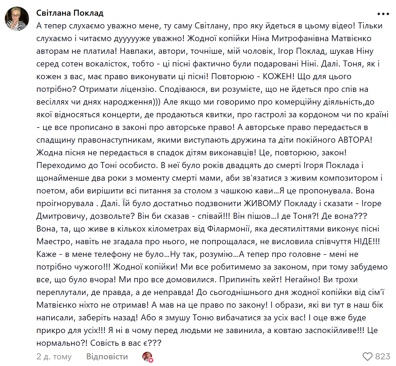 Видео об этом появилось на тикток-аккаунте gopatsa. В комментариях люди отреагировали по-разному. В частности, оказалось, что не все поняли, почему Тоня Матвиенко не имеет права петь песни, которые ранее исполняла ее мама. Поэтому жена Игоря Поклада – Светлана написала комментарий под роликом, где выложила свое объяснение.