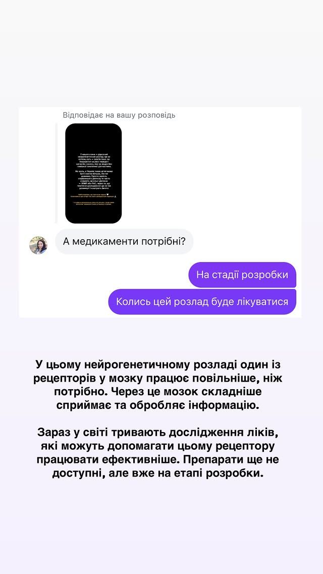 Блогер рассказала, что сейчас генетические исследования не так развиты и дорого стоят, поэтому в Украине детей с таким диагнозом может быть значительно больше. В мире уже исследуют лекарства, которые могут помочь, однако они еще не доступны.