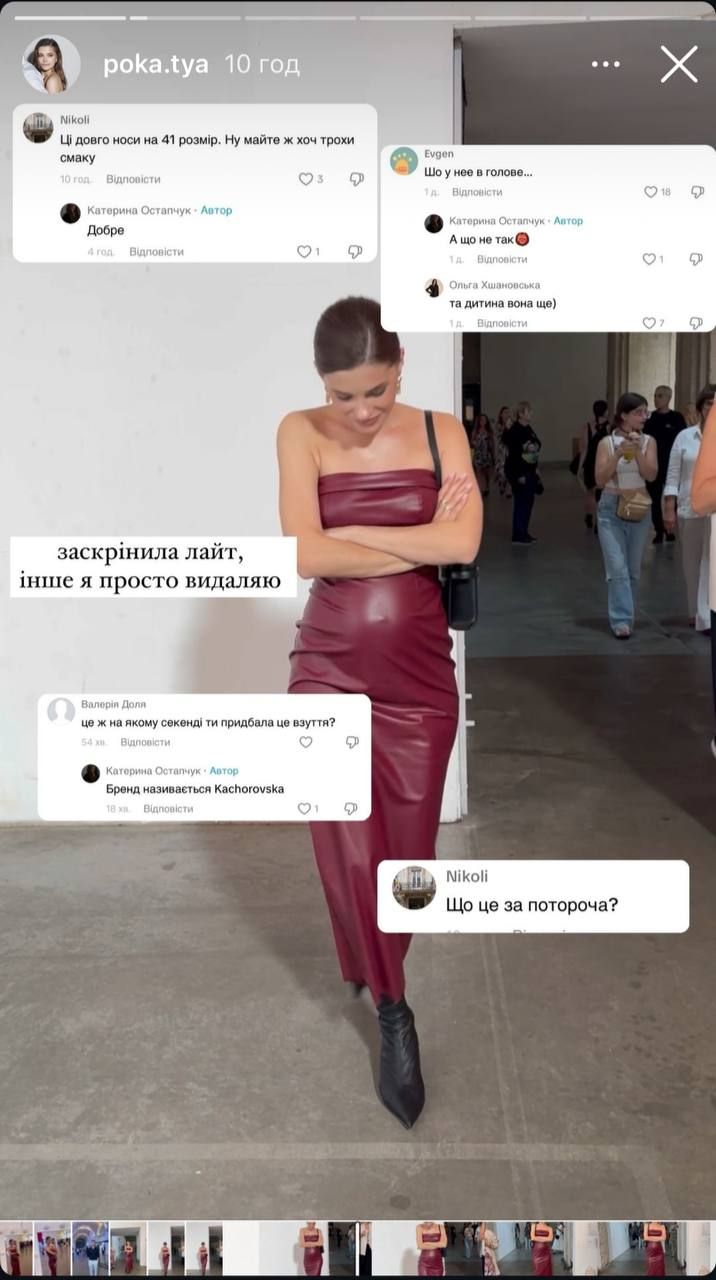 Екатерина Полтавская на днях поделилась новым видео с модного показа и показала свой образ в бордовом кожаном платье. В ответ она получила немало хейтерских комментариев.