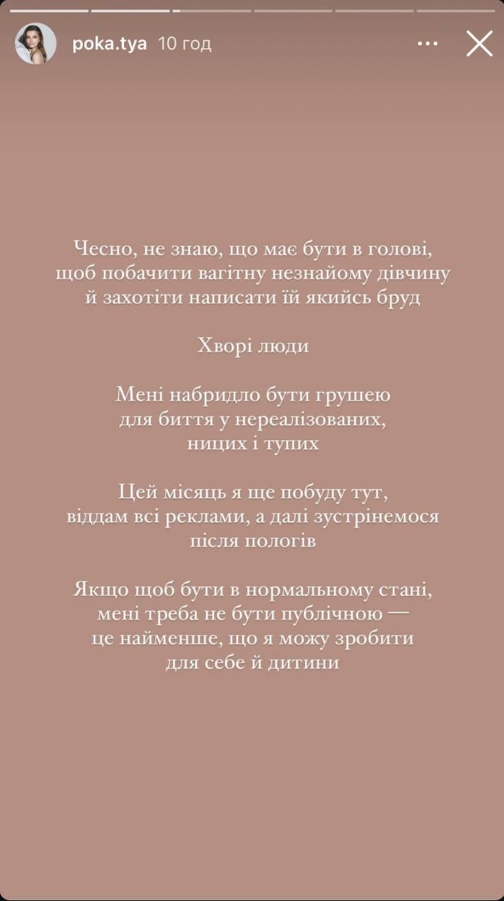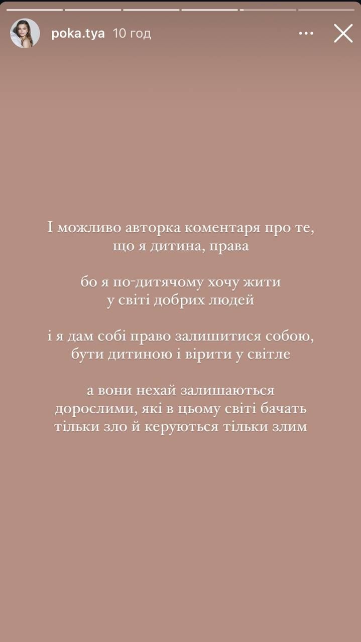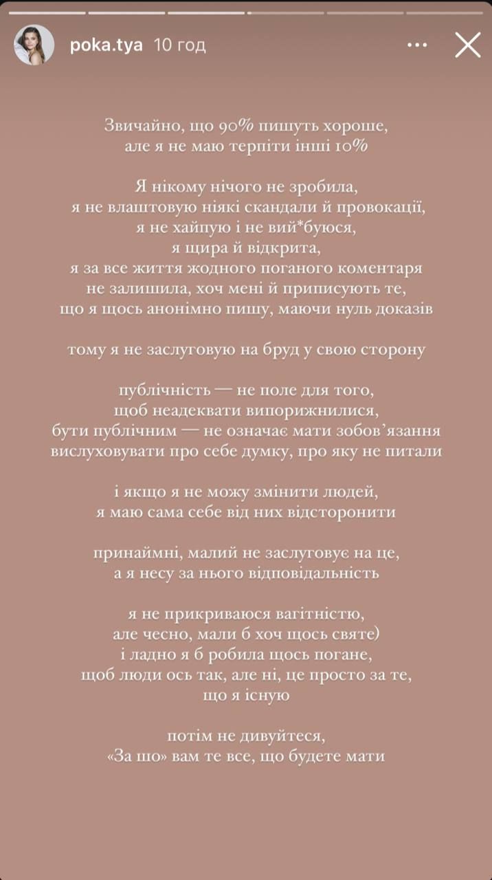 "Я никому ничего не сделала, я не устраиваю никакие скандалы и провокации, я не хайпую и не вы*буюсь, я искренняя и открытая. Я за всю жизнь ни одного плохого комментария не оставила, хотя мне приписывают то, что я что-то анонимно пишу, имея ноль доказательств. Поэтому я не заслуживаю грязи в свою сторону. И если я не могу изменить людей, я должна сама себя от них отстранить. По крайней мере, малый не заслуживает этого, а я несу за него ответственность", – написала Полтавская.