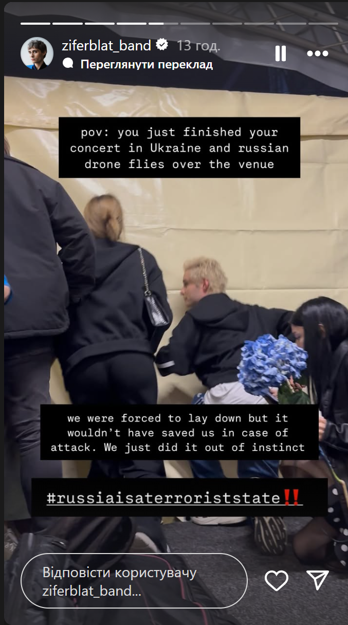 Pov: ты только что закончил свой концерт в Украине и российский дрон пролетает над площадкой. Нас заставили лечь, но это бы не спасло нас в случае атаки. Мы просто сделали это инстинктивно. Россия – террористическое государство,