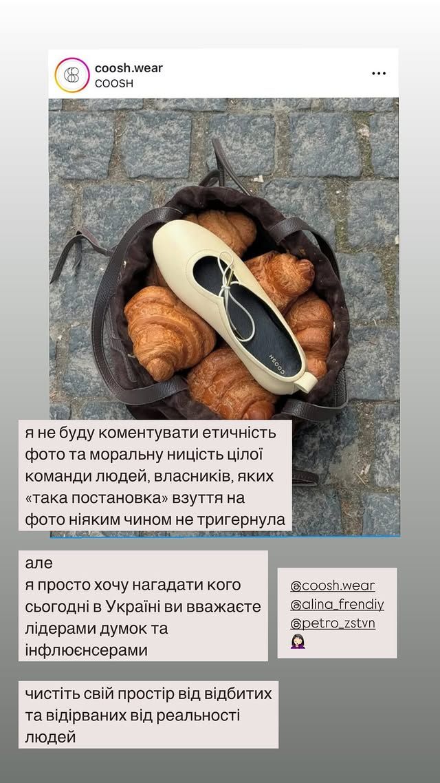 Не буду комментировать этичность фото и моральную низость целой команды людей, владельцев, которых такая постановка обуви на фото никаким образом не триггернула. Но я просто хочу напомнить, кого сегодня в Украине вы считаете лидерами мнений и инфлюенсерами. Чистите свое пространство от отраженных и оторванных от реальности людей,