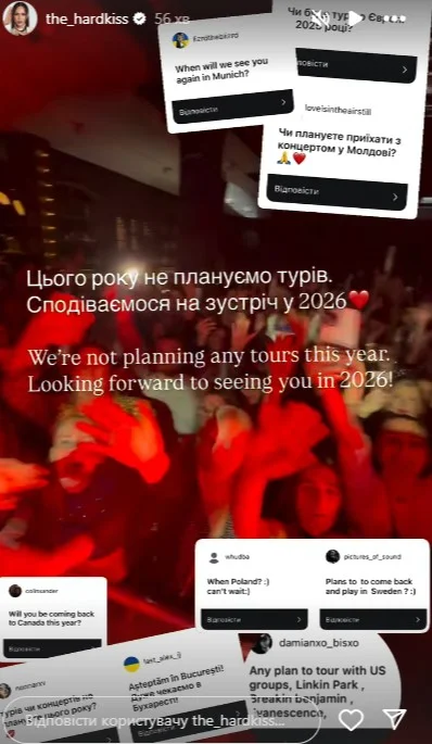 Нагадаємо, після початку повномасштабного вторгнення The Hardkiss давали здебільшого благодійні концерти за кордоном. В Україні виступала лише Юлія Саніна. Вона їздила в сольний тур Україною Special Kiss.