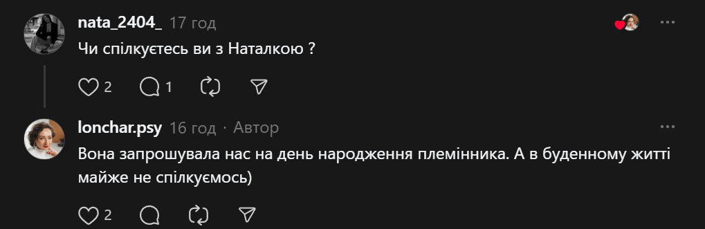 У коментарях у неї поцікавились, чи вона спілкується з колишньою дружиною брата. Наталка Денисенко запрошувала Катерину на день народження племінника, та в буденному житті вони майже не спілкуються.