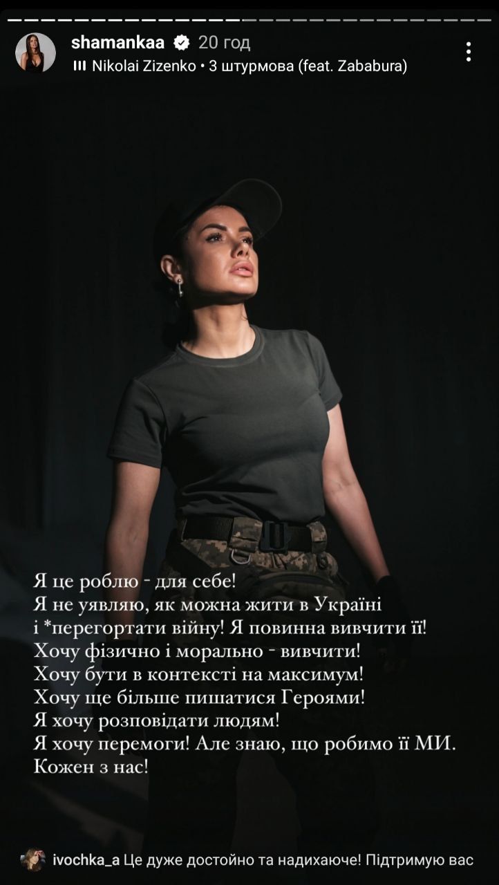 Шаманська, крім того, написала, що не уявляє, "як можна жити в Україні й перегортати війну". Жінка зауважила, що повинна вивчити її як морально, так і фізично, та хоче бути в контексті на максимум.