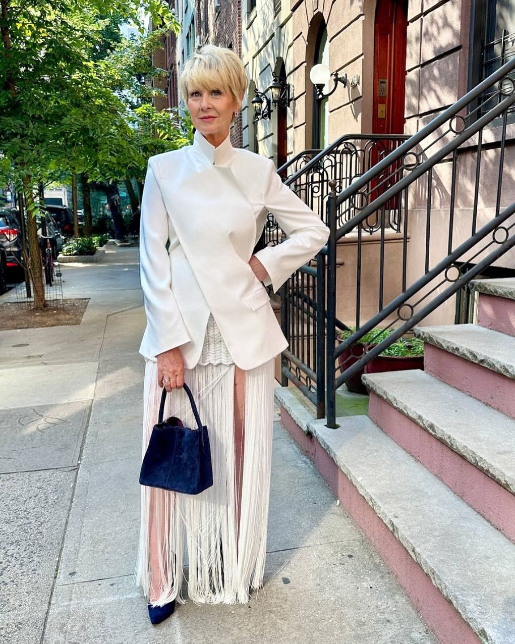 Синтія Ніксон показалася у вбранні білого кольору від бренду BEVZA. Вона обрала жакет навхрест, який коштує понад 30 тисяч гривень, та сукню з бахромою. Акторка доповнила свій образ синіми туфлями та сумочкою. Зірка серіалу "Секс і місто" одягла сережки, елегантно вклала волосся та зробила легкий макіяж.