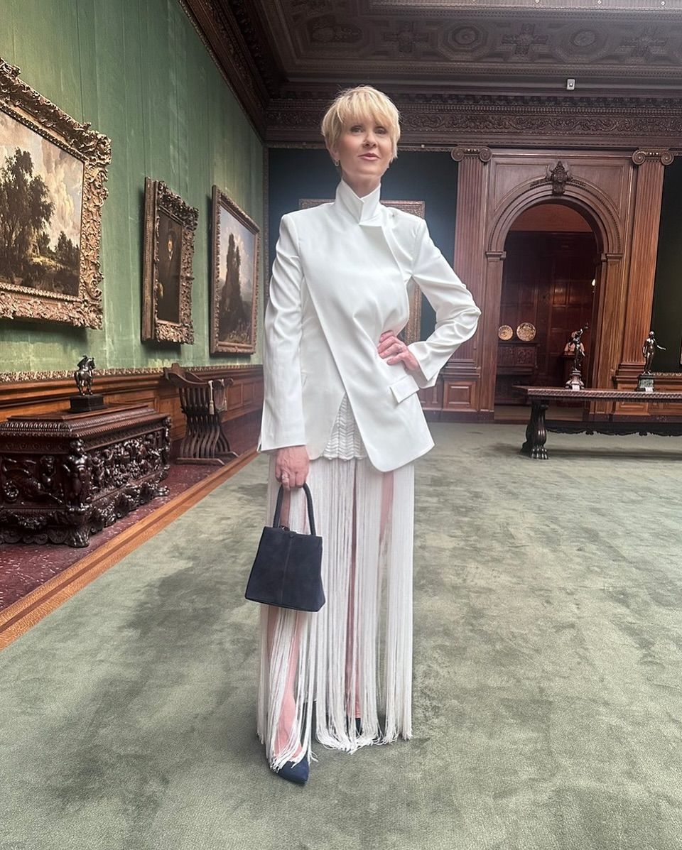 - Синтія Ніксон одягла вбрання від київського бренду BEVZA, що включало білий жакет та сукню з бахромою.