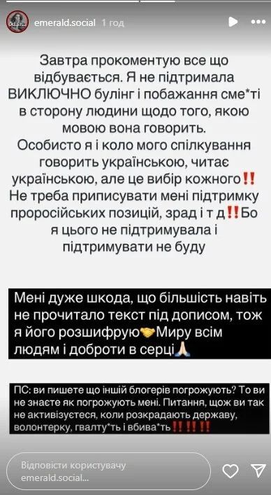 Така позиція викликала негативну реакцію серед користувачів соціальних мереж, після чого Емеральд змушена була пояснити свою заяву. Вона підкреслила, що не підтримувала безпосередньо Алхім, а виступила проти агресивних нападок та погроз на адресу блогерки через її мовний вибір.
