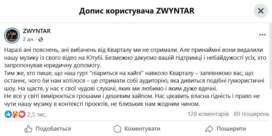 "Квартал 95" не попросив вибачення у гурту Zwyntar / Скриншот з фейсбуку