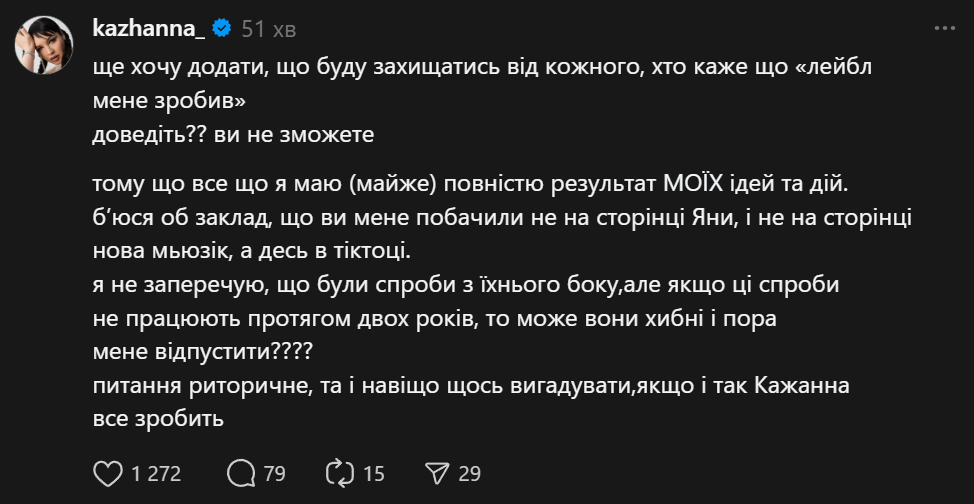 Вона також опублікувала допис у Threads, де заявила, що не погоджується з тезою про те, що її успіх є заслугою лейблу.
