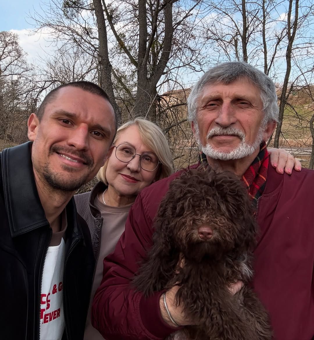 Тарас Цимбалюк поділився селфі з мамою Тетяною Василівною, татом Василем Васильовичем та псом. Вони сфотографувалися у рідному місті актора – Корсунь-Шевченківському Черкаської області.