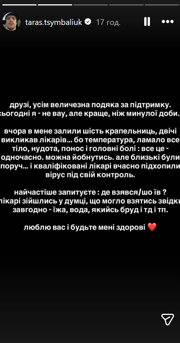 - Український актор Тарас Цимбалюк повідомив про гостре отруєння та поділився досвідом лікування, включаючи шість крапельниць і медичну допомогу через симптоми, такі як висока температура та головні болі.