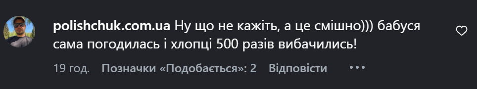 - "Це смішно. Бабуся сама погодилась і хлопці 500 разів попросили вибачення";