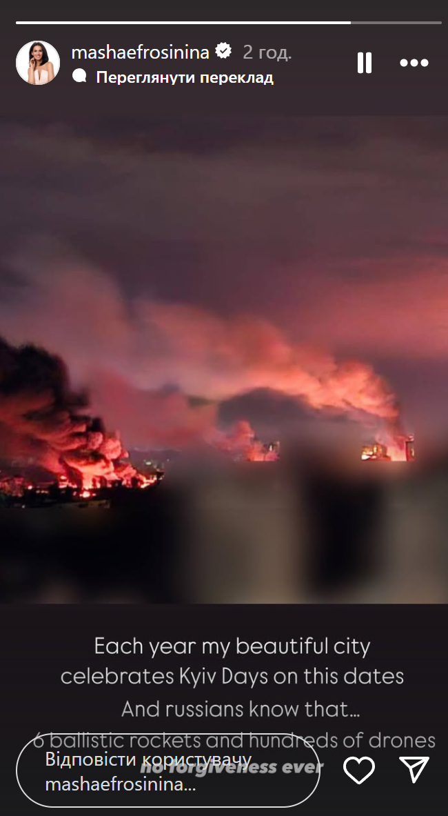 Маша Єфросиніна відреагувала на ракетний обстріл Києва / Скриншот з інстаграм-сторіс