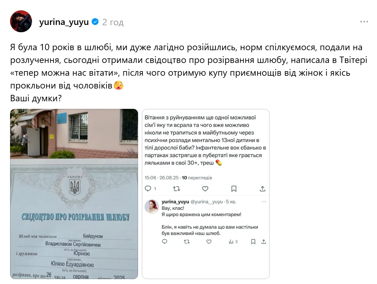 Юлія Юріна оголосила про розлучення з чоловіком / Скриншоти з Threads