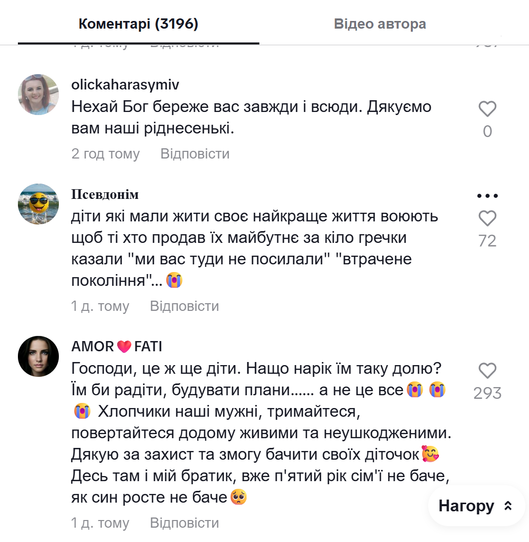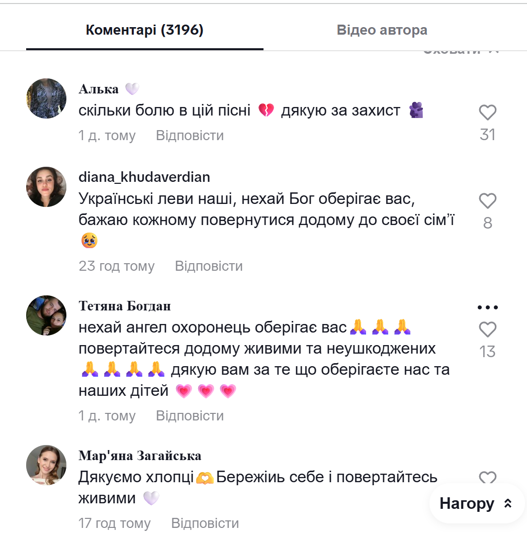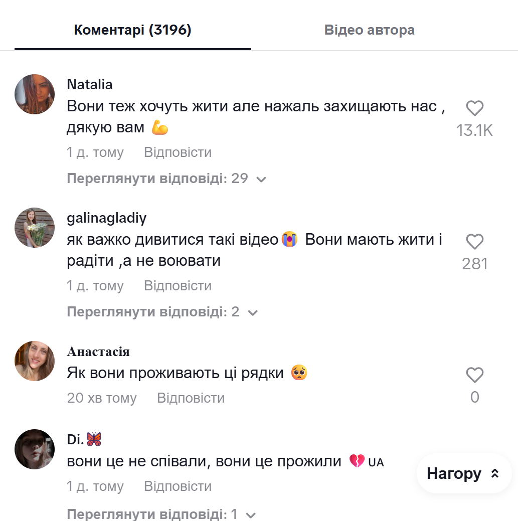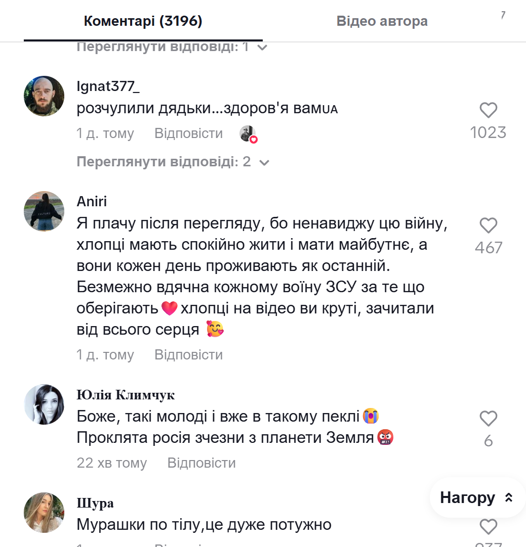 Емоції, з якими юні військові виконували трек, зворушили користувачів тіктоку. У коментарях вони поділилися своїми враженнями після перегляду та подякували захисникам за їхню роботу.