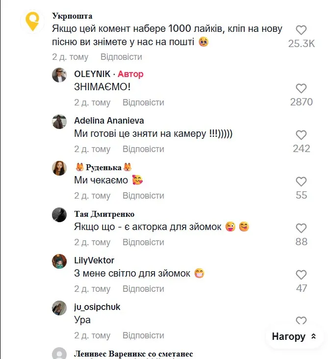 До речі, Укрпошта запропонувала Олійнику зняти кліп на нову пісню у них, якщо коментар набере 1000 лайків. Він вже зібрав понад 25 тисяч лайків, а сам співак погодився на пропозицію.