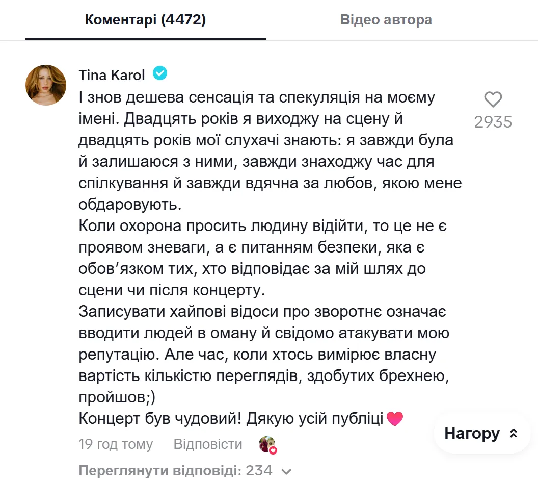 Так, блогер розповів, що відвідав концерт Тіни Кароль у Запоріжжі, але йому не сподобалося ставлення виконавиці до її прихильників. За словами чоловіка, співачка не з усіма охочими сфотографувалася після виступу, а її охорона попросила розступитися, щоб Тіна Кароль пройшла.