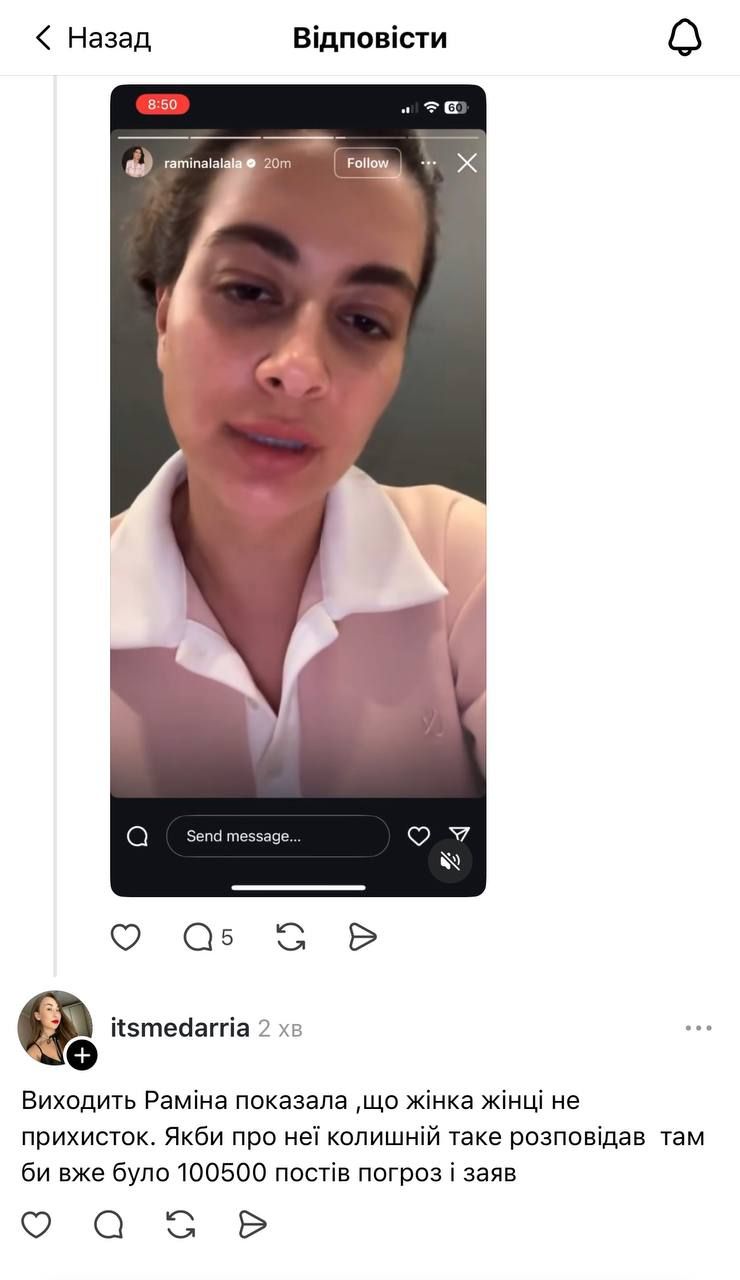 Учора Раміна Есхакзай записала відеозвернення до людей, які її критикують. Наразі ці відео видалені з її інстаграму.