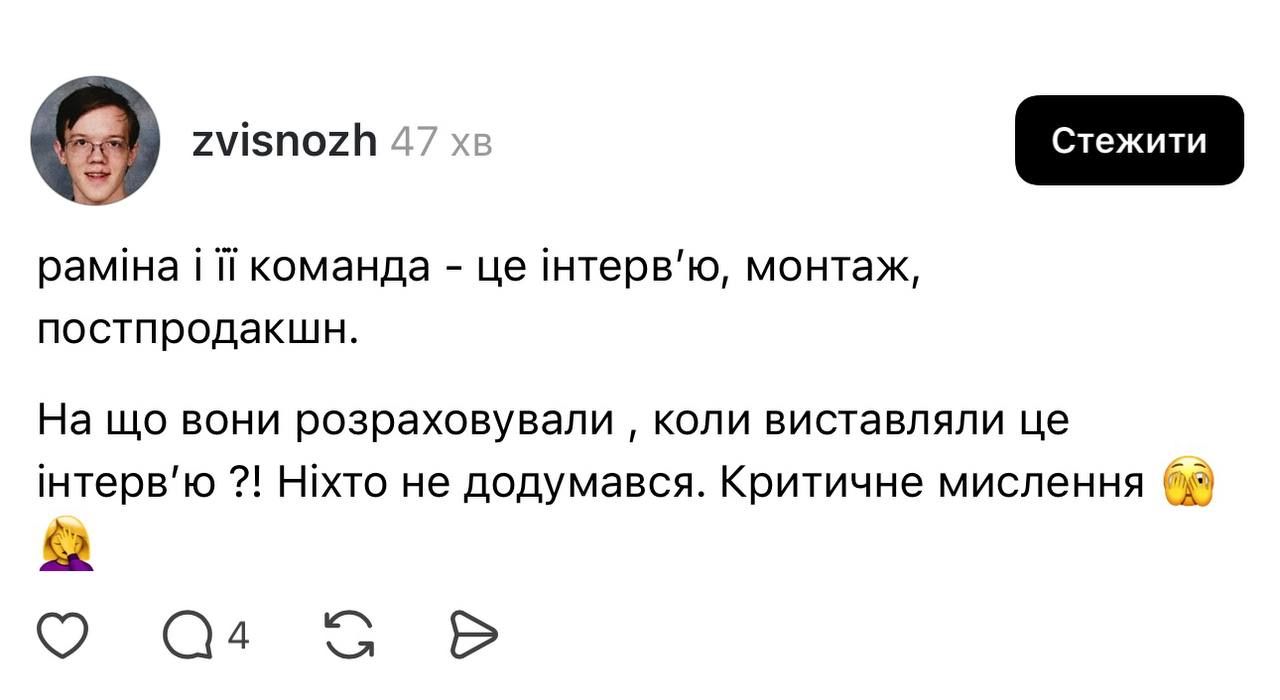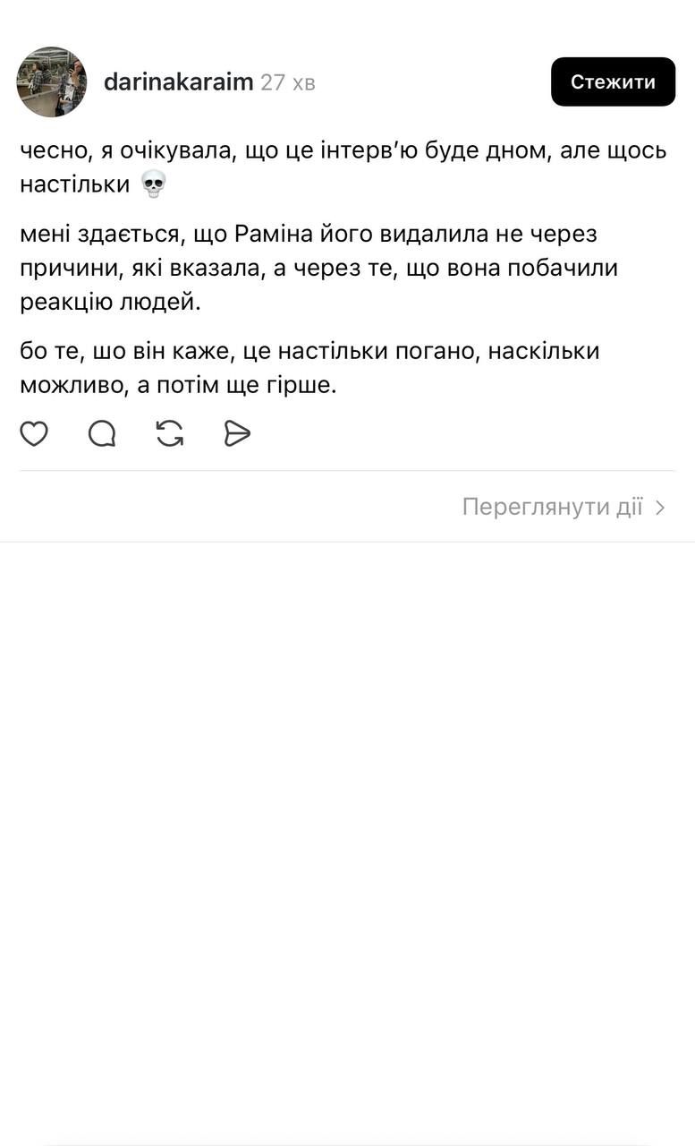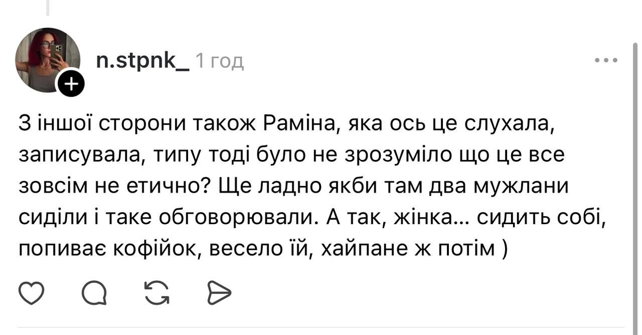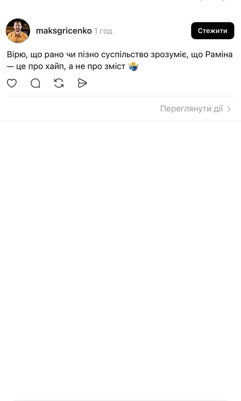 - "Вірю, що рано чи пізно суспільство зрозуміє, що Раміна – це про хайп, а не про зміст".