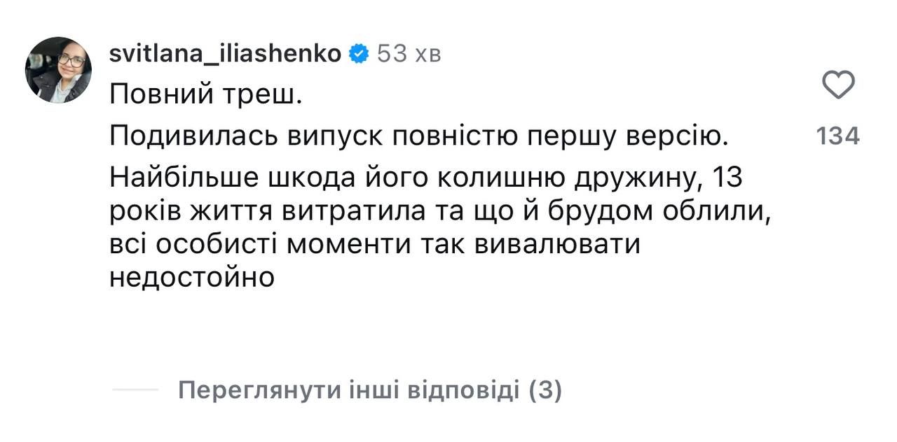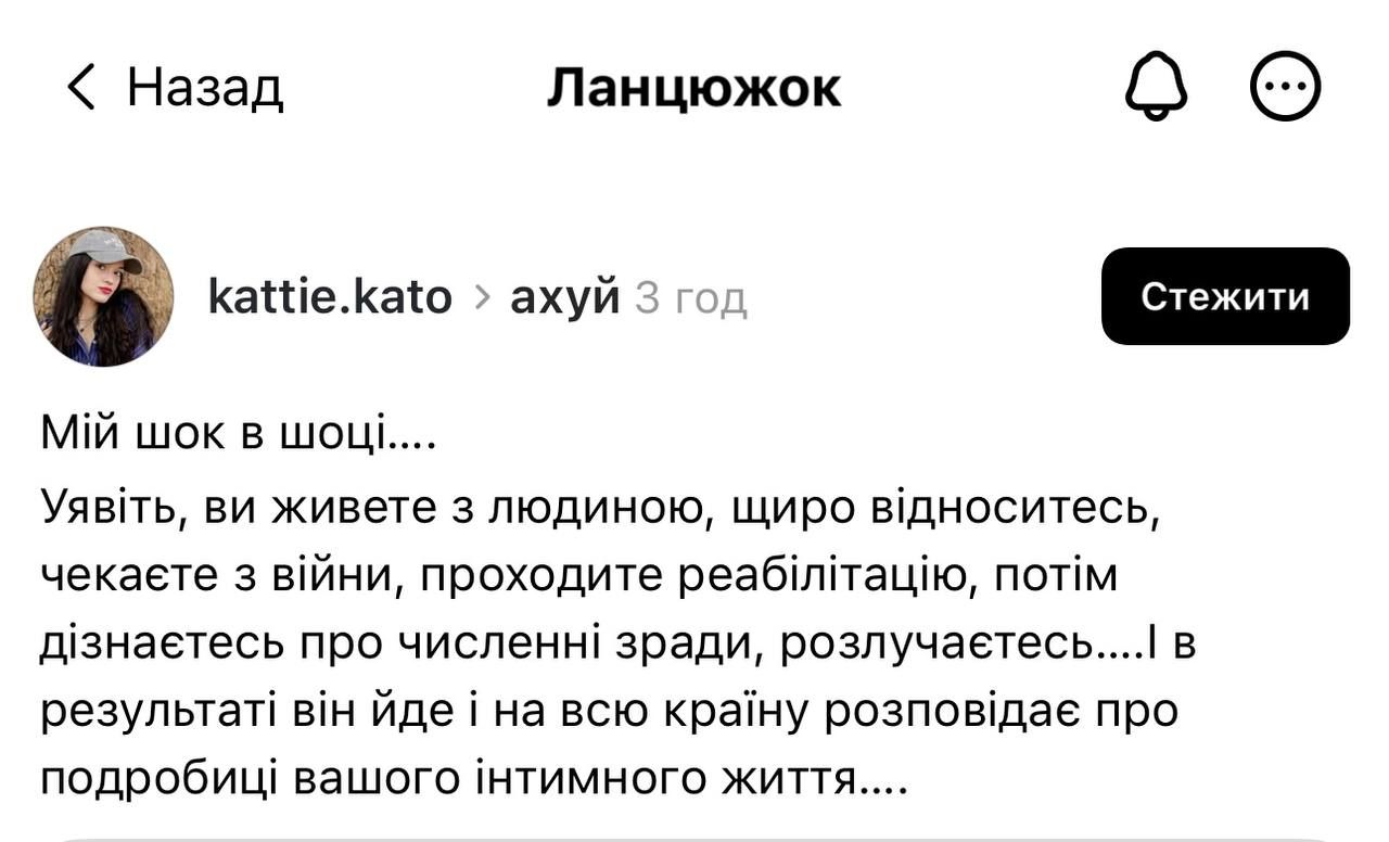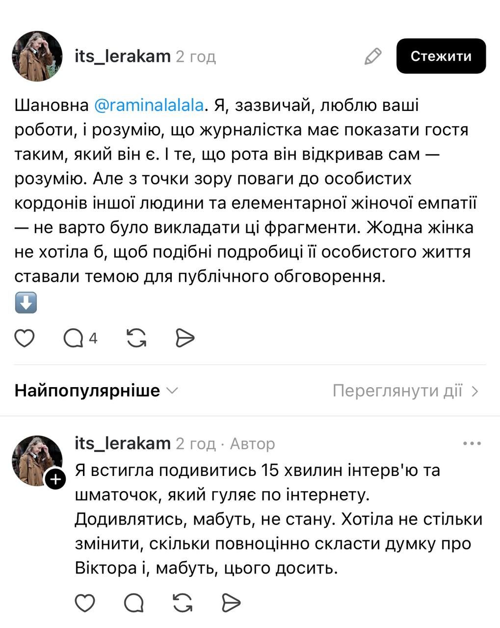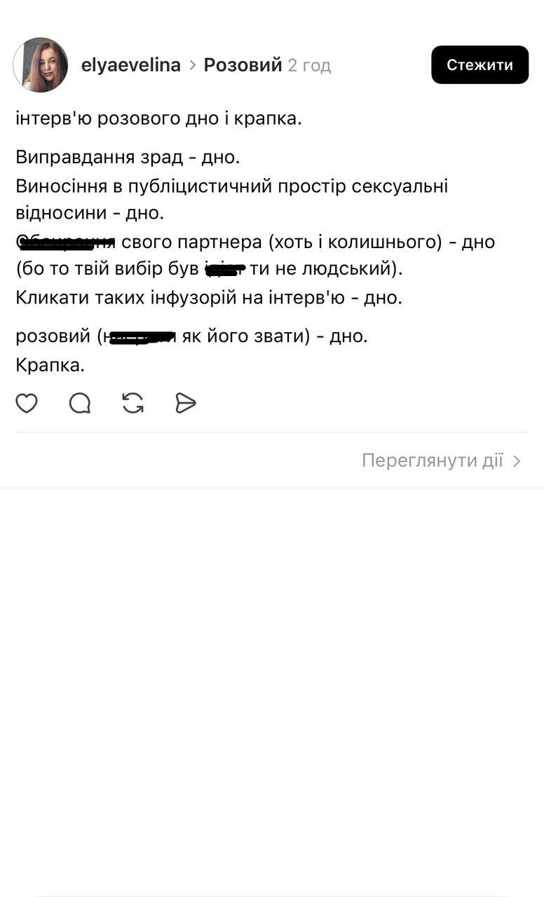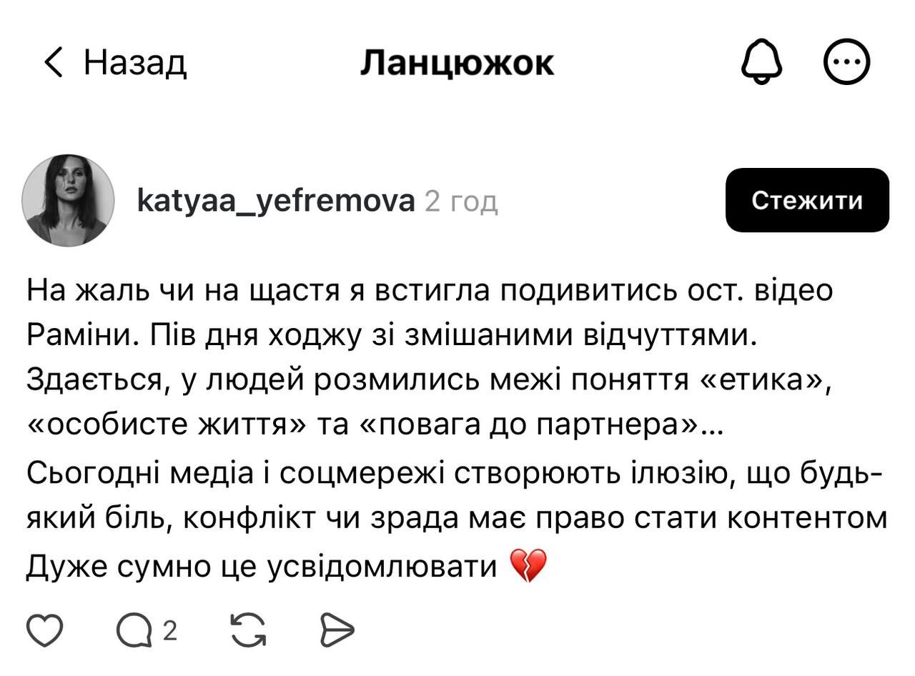 - "Здається, у людей розмились межі поняття "етика", "особисте життя" та "повага до партнера". Сьогодні медіа та соцмережі створюють ілюзію, що будь-який біль, конфлікт чи зрада має право стати контентом".