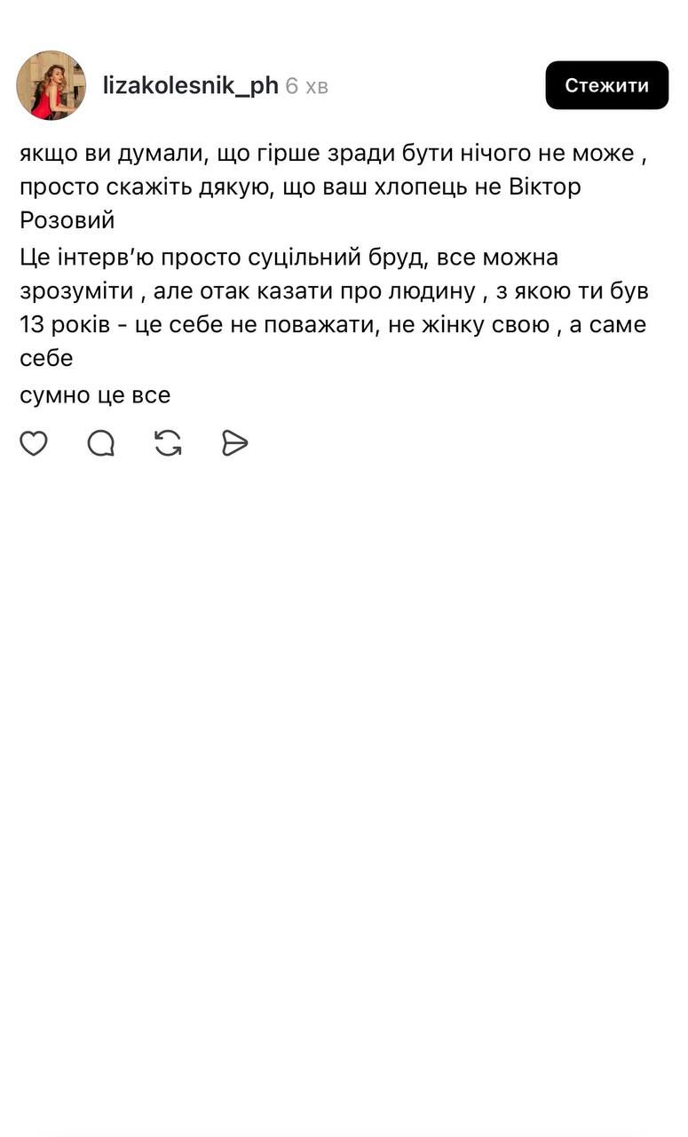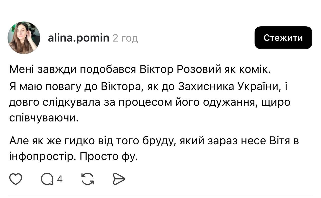 - "Мені завжди подобався Віктор Розовий як комік. Я маю повагу до Віктора як до захисника України й довго слідкувала за процесом його одужання, щиро співчуваючи. Але як же гидко від того бруду, який зараз несе Вітя в інфопростір".