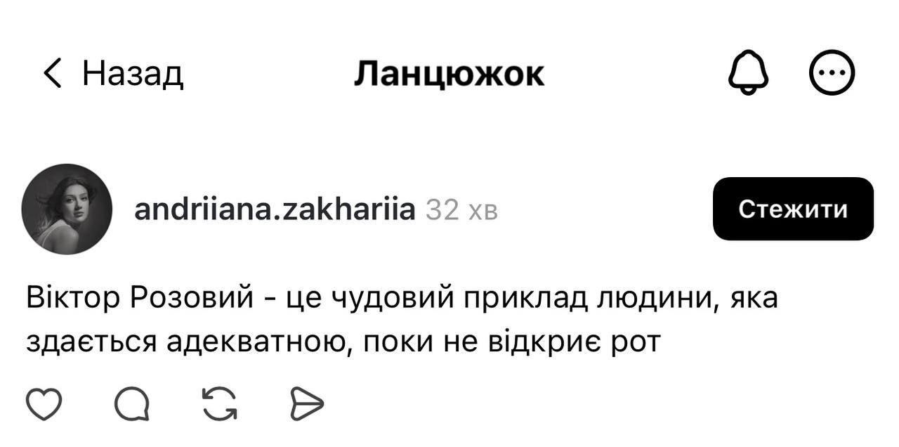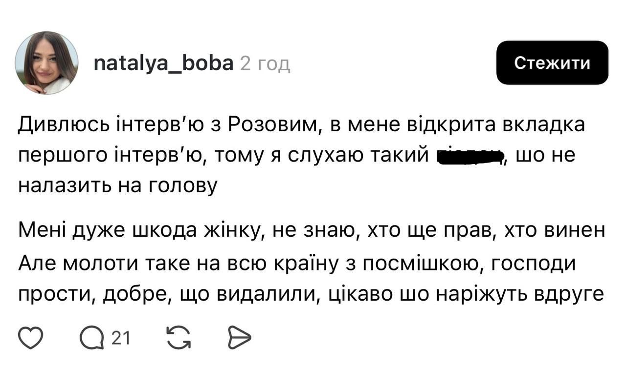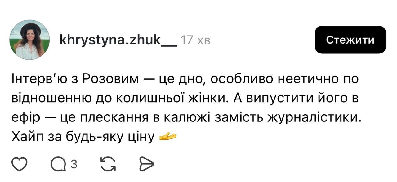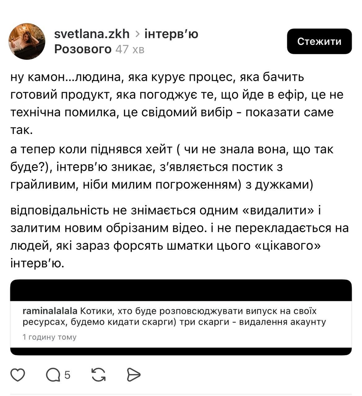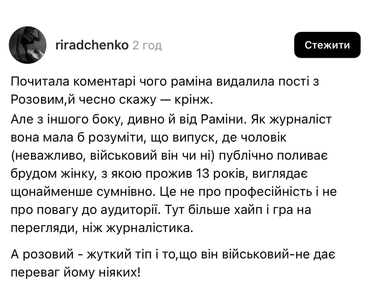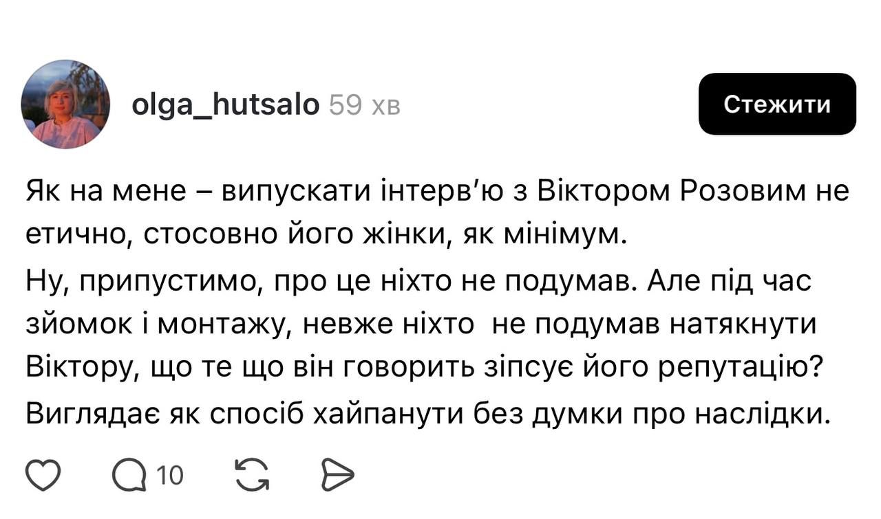- "Інтерв'ю з Розовим – це дно, особливо неетично стосовно колишньої дружини. А випустити його в ефір – це плескання в калюжі замість журналістики. Хайп за будь-яку ціну".