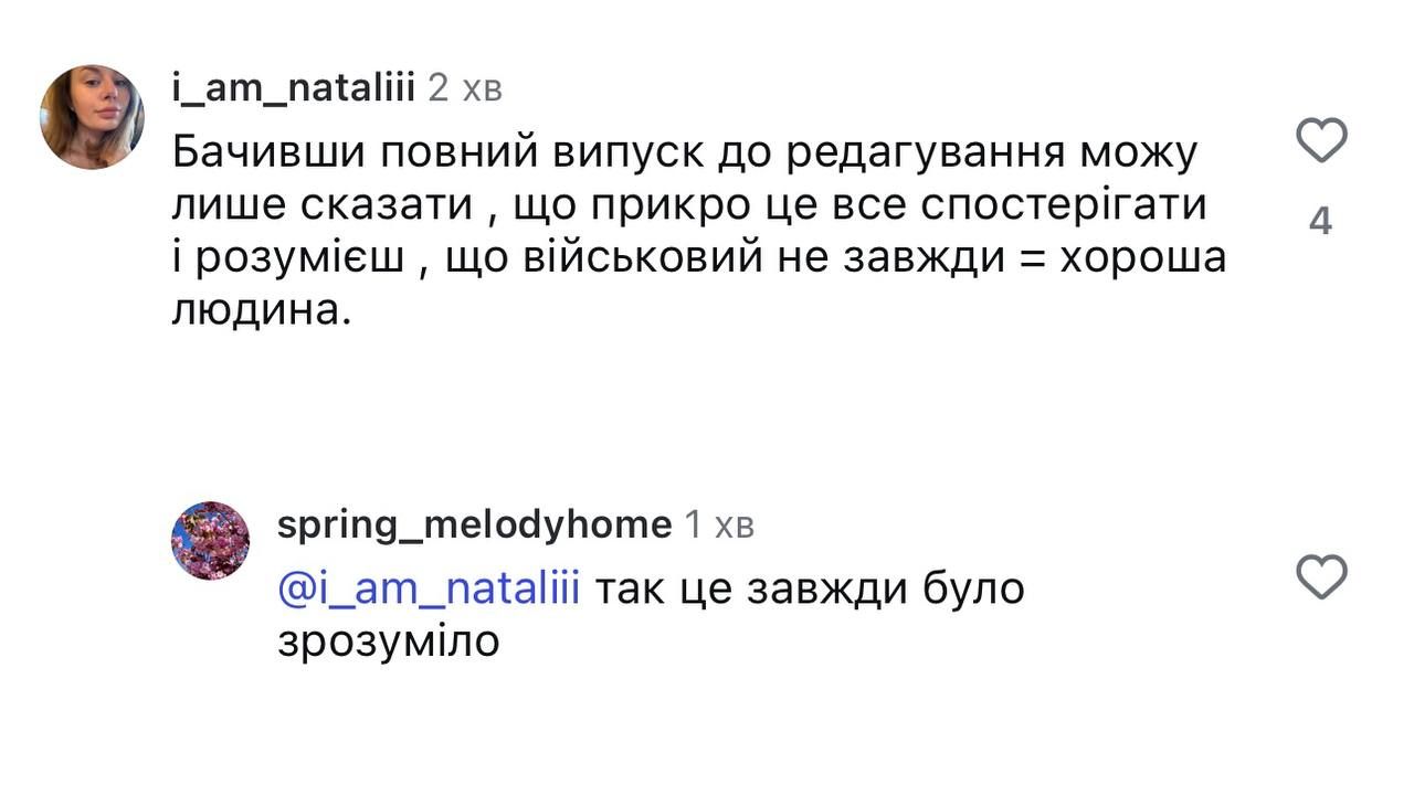 - "Бачивши повний випуск до редагування, можу лише сказати, що прикро це все спостерігати й розумієш, що військовий не завжди дорівнює хороша людина".