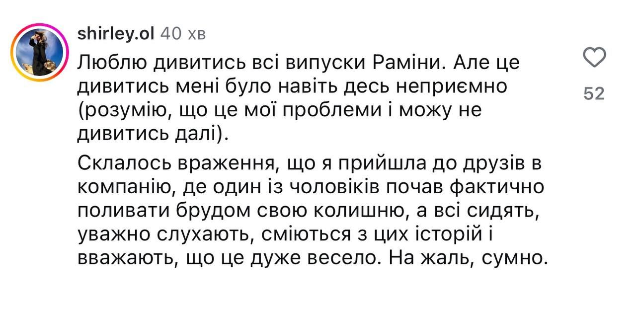- "Огидно, що Раміна сидить посміхається на цю розповідь. І навіть тоді, під час зйомки, у неї етичних сумнівів не виникло".