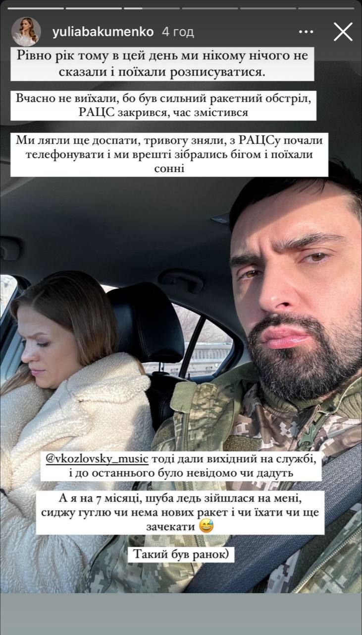 Ми нікому нічого не сказали й поїхали розписуватися. Вчасно не виїхали, бо був сильний ракетний обстріл, РАЦС закрився, час змістився. Ми лягли ще доспати, тривогу скасували. З РАЦСу почали телефонувати й ми врешті зібрались бігом і поїхали сонні,
