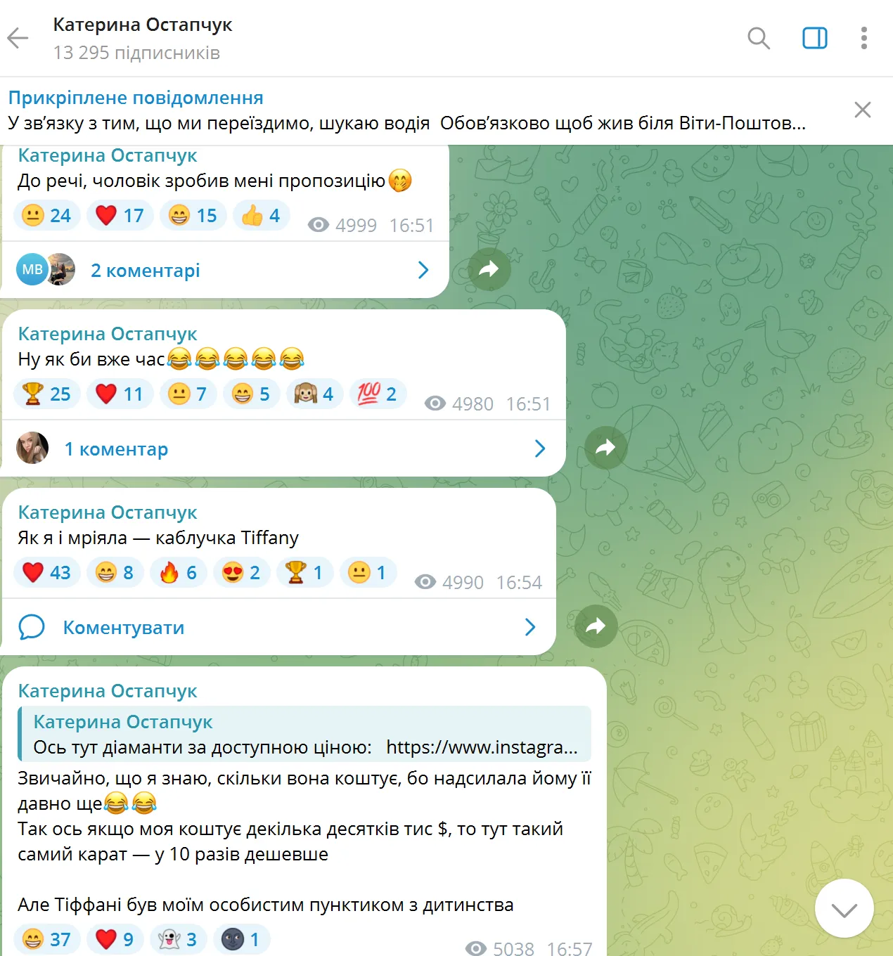 Я знаю, скільки вона коштує, бо надсилала йому її давно ще. Моя коштує декілька десятків тисяч доларів. Але Tiffany – мій особистий пунктик від дитинства. Чесно, тоді мені здавалося, що в мене ніколи в житті не буде такої каблучки. Я думала, що це нереально. Мрійте! Кожна з нас заслуговує найкращого,