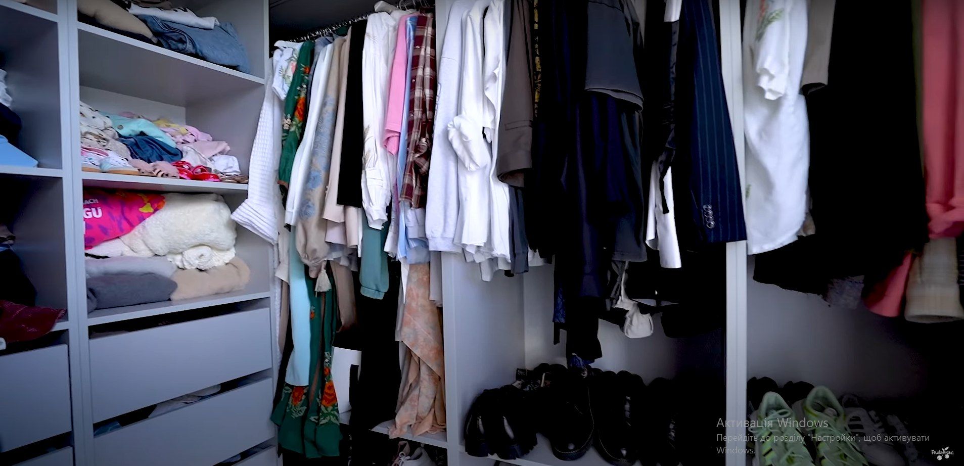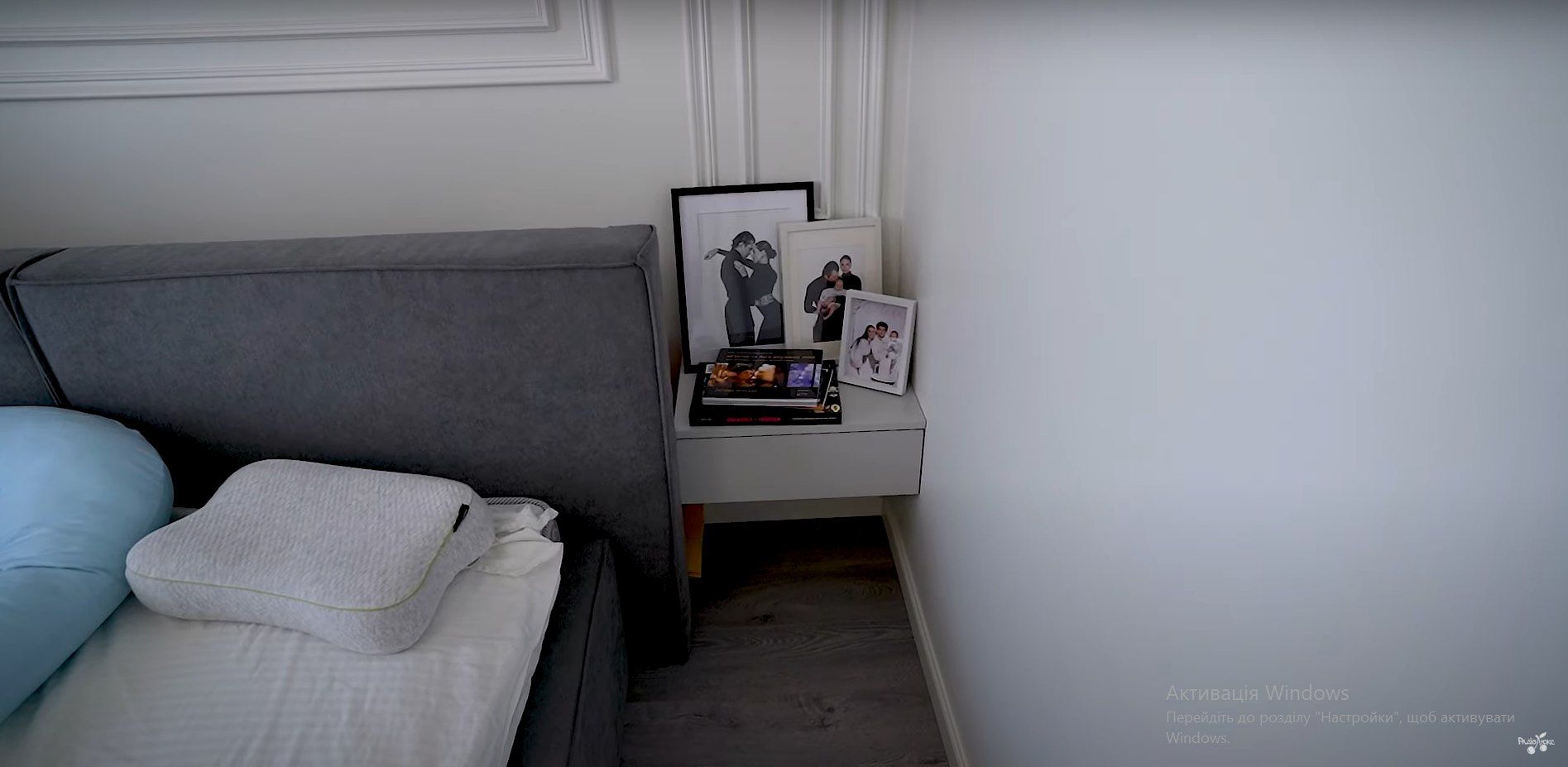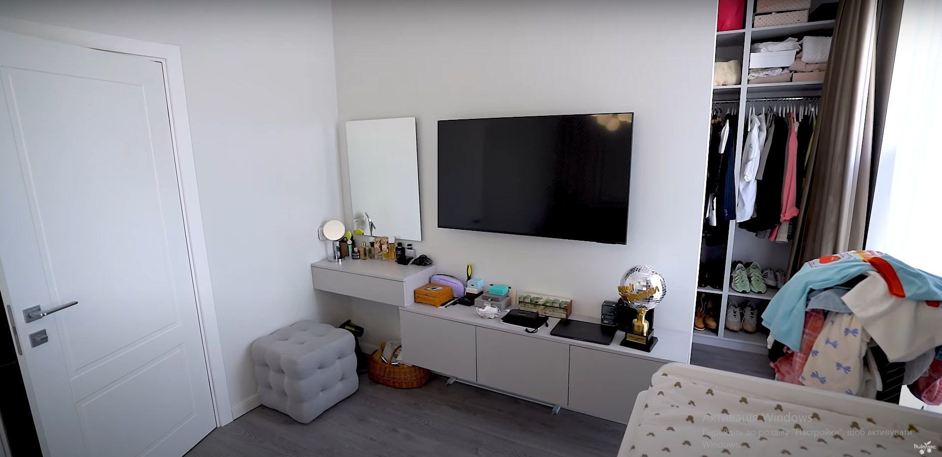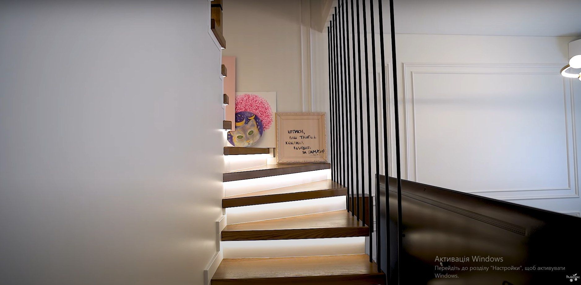 На другий поверх ведуть сходи, на яких є підсвітка і стоять картини. Спальня зроблена у світлих тонах, поруч гардеробна, де сім'я зберігає речі. Леля, донька Євгена і Наталії, має дитячу кімнату.