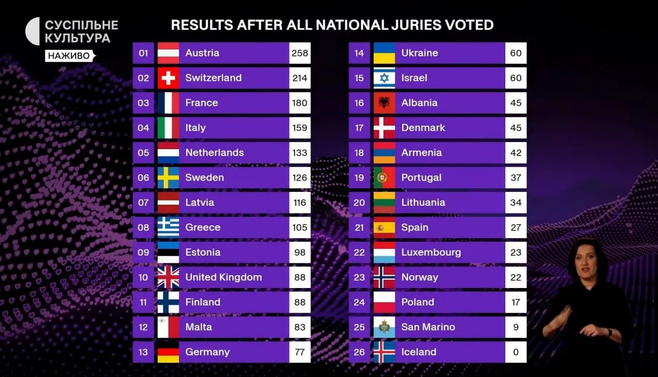 Результати голосування Національного журі! Швеція віддала 12 балів Австрії; Азербайджан – Ізраїлю; Мальта – Вірменії; Нідерланди – Австрії; Словенія – Італії; Вірменія – Франції; Люксембург – Франції; Сан-Марино – Італії; Україна – Німеччині; Норвегія – Австрії; Австрія – Фінляндії; Франція – Албанії; Італія – Великій Британії; Португалія – Італії; Данія – Латвії; Хорватія – Італії; Латвія – Австрії; Ірландія – Австрії; Польща – Швейцарії; Чорногорія – Греції; Греція – Франції; Сербія – Франції; Чехія – Німеччині; Велика Британія – Латвії; Іспанія – Швейцарії; Фінляндія – Австрії; Австралія – Греції; Німеччина – Австрії; Бельгія – Австрії; Ізраїль – Греції; Албанія – Франції; Литва – Латвії; Ісландія – Швеції; Грузія – Італії; Кіпр – Греції; Естонія – Швейцарії; Швейцарія – Італії.