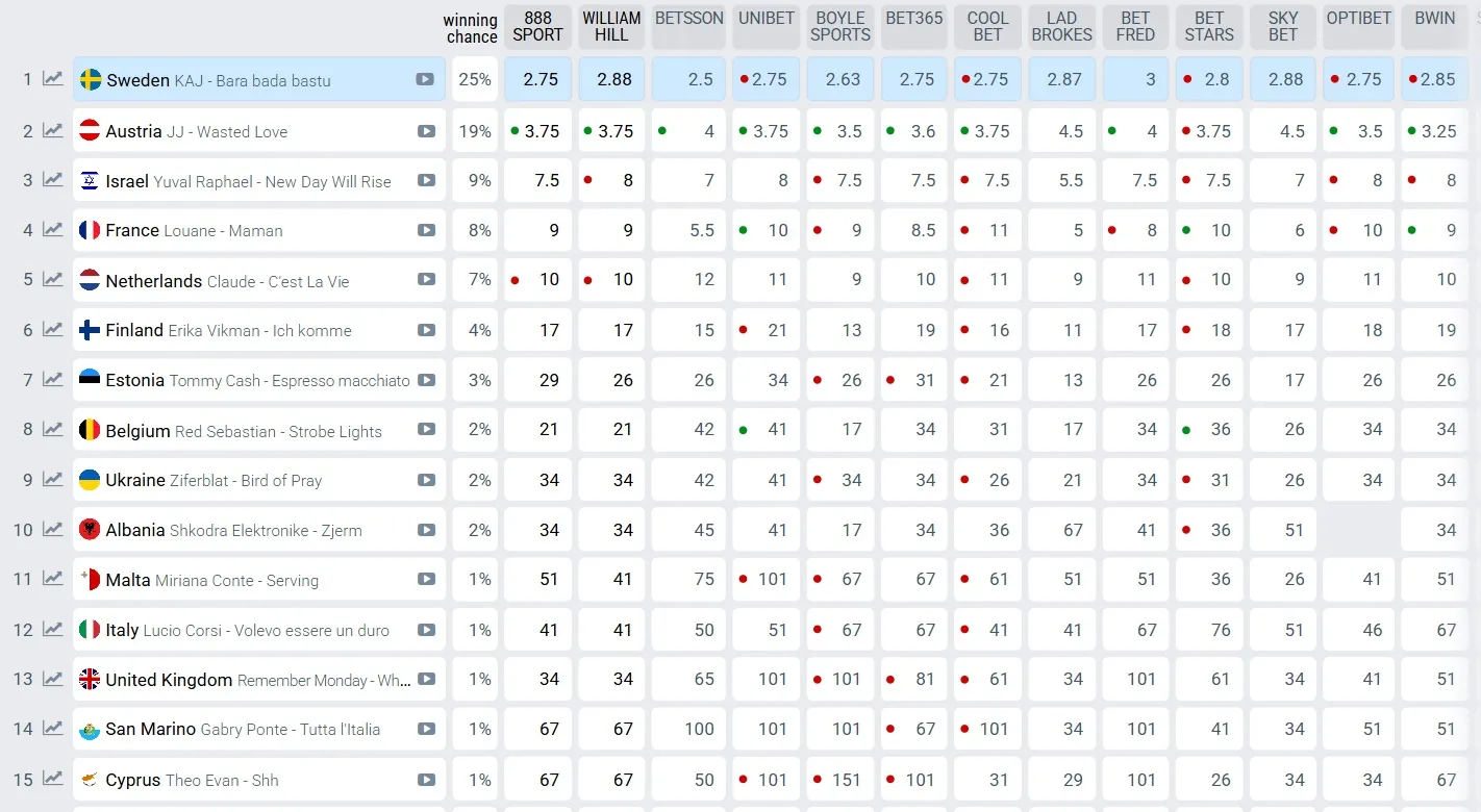 Кому букмекери прогнозують перемогу на Євробаченні-2025 / Скриншот з сайту Eurovisionworld