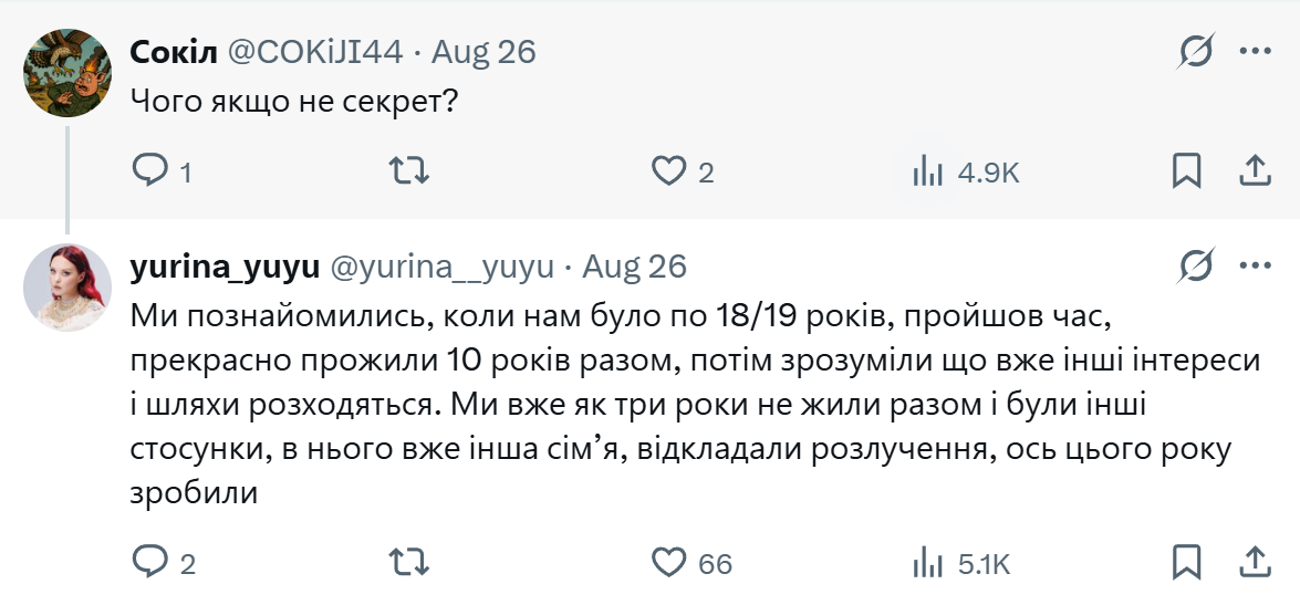 Юлія пояснила, що їхня історія почалася ще в юності: вони познайомилися, коли їм було всього 18-19 років, і прожили разом щасливі десять років. Проте з часом обидва зрозуміли, що мають різні інтереси та йдуть різними шляхами.