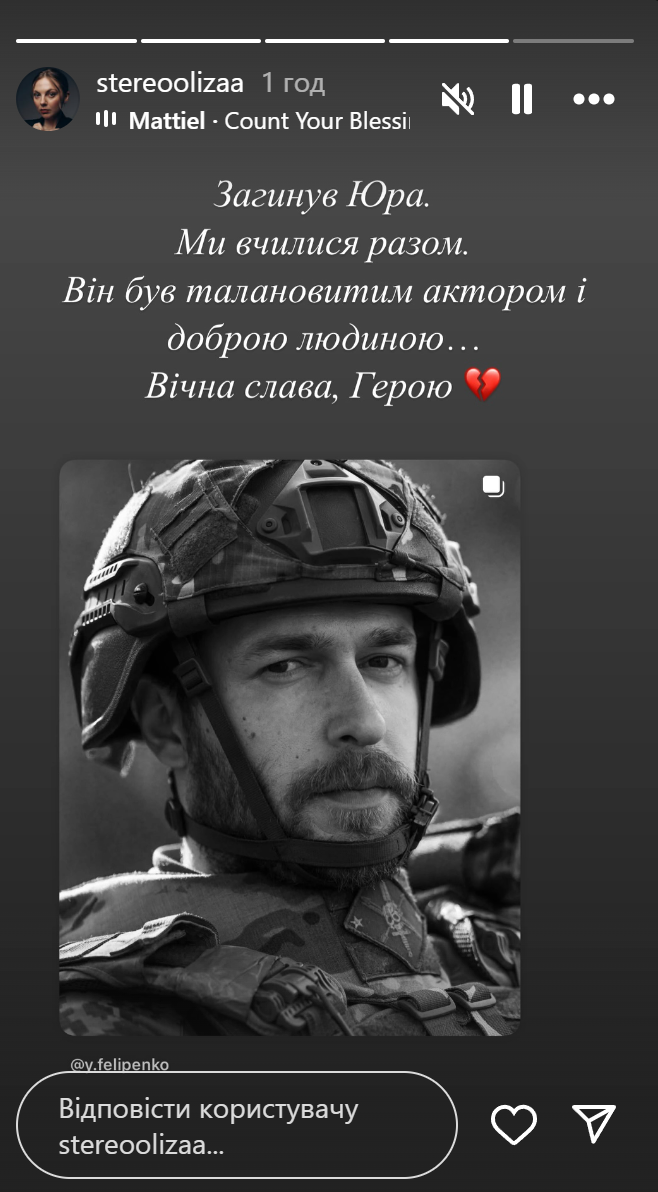 Так, Анна Кошмал поділилася фото Юрія в інстаграм-сторіс і висловила жаль щодо його загибелі.