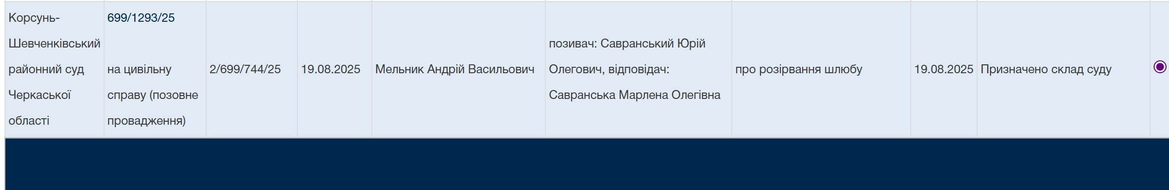Так, у реєстрі судових рішень з'явилася справа про розірвання шлюбу Савранського Юрія та Савранської Марлени. Позов надійшов до Корсунь-Шевченківського районного суду Черкаської області ще 19 серпня. Ініціаторкою розлучення став сам чоловік.