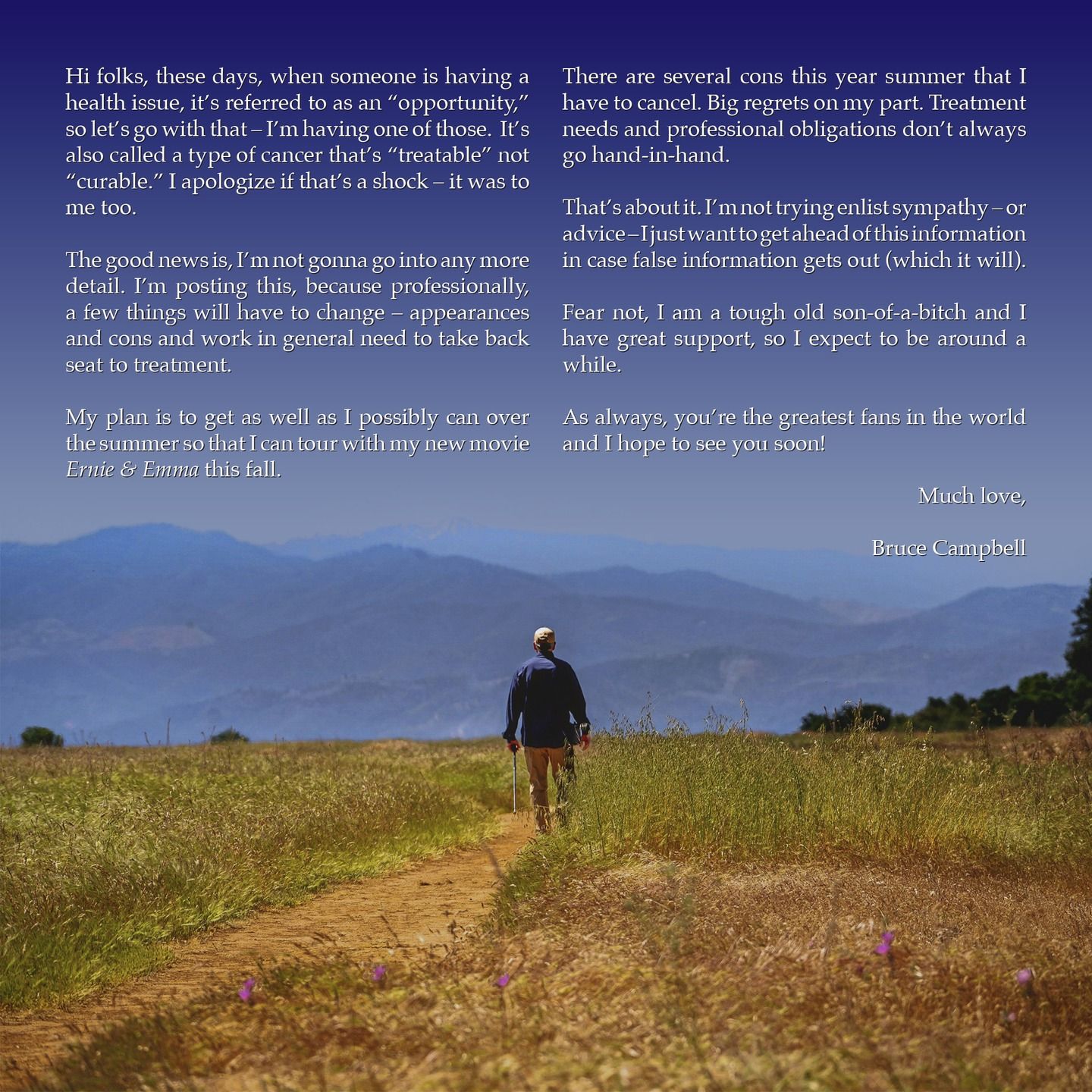 Брюс Кемпбелл зазначив, що тип раку, який у нього діагностували, не вважається "виліковним", але "піддається лікуванню. Однак він не готовий вдаватися у подробиці.