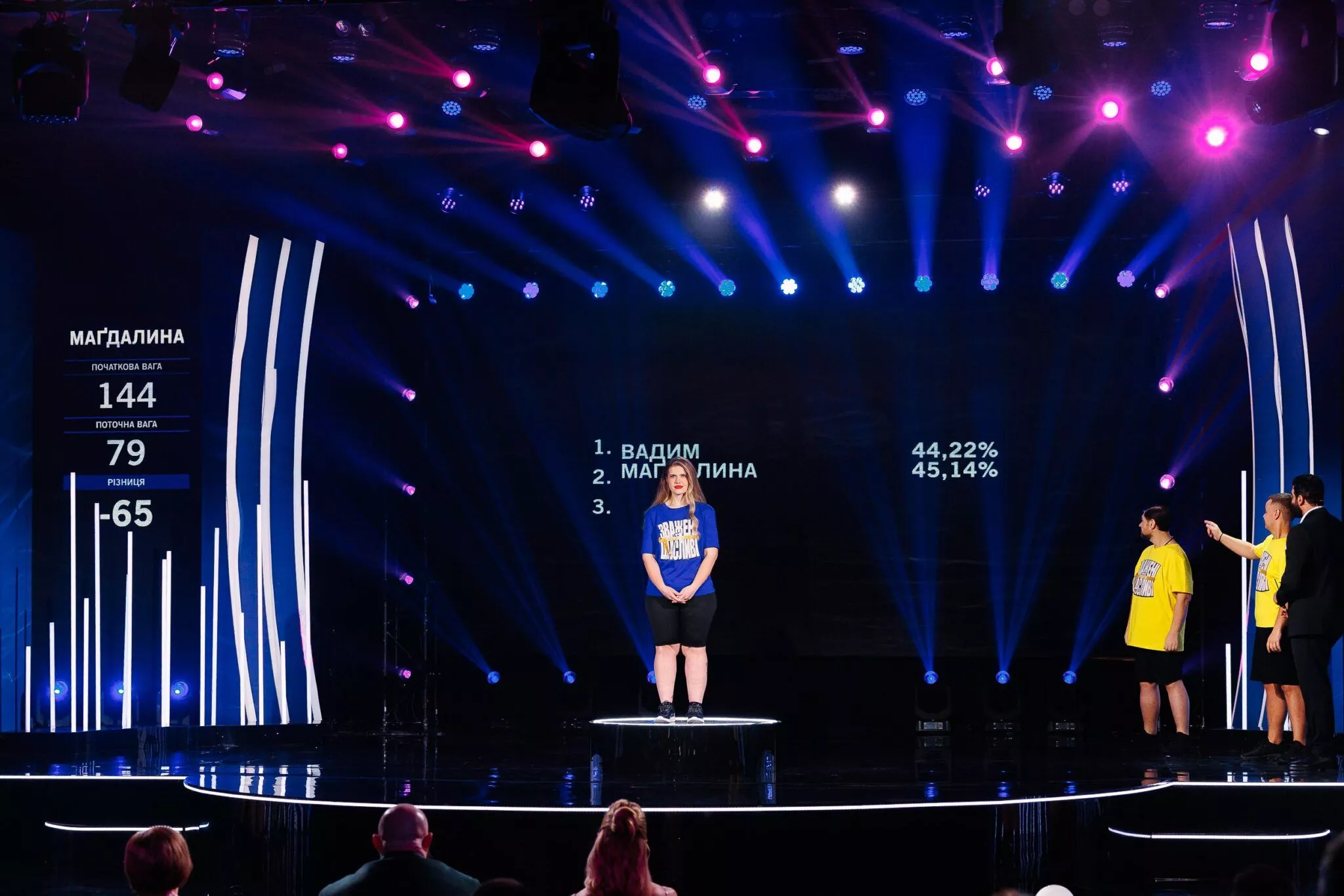 - Інші фіналісти, Вадим Бойко та Маґдалина Димид, відповідно скинули 65 кілограмів кожен, з відсотковими показниками втрати ваги 44,22% і 45,14%.