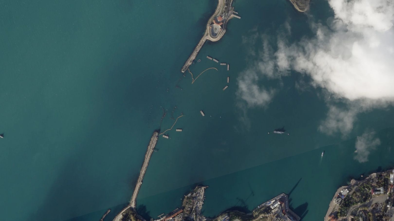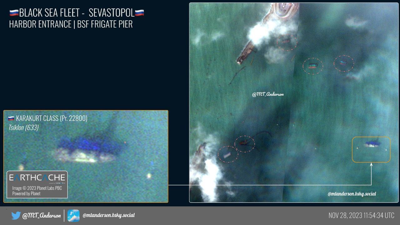 Крім того, на супутникових знімках також не видно барж, які росіяни навмисно затоплювали для захисту Кримського мосту. Втім, на супутникових знімках видно декілька суден, які пришвартовані у бухтах. Також біля них є, ймовірно, бонові загородження, але у якому вони стані – невідомо.