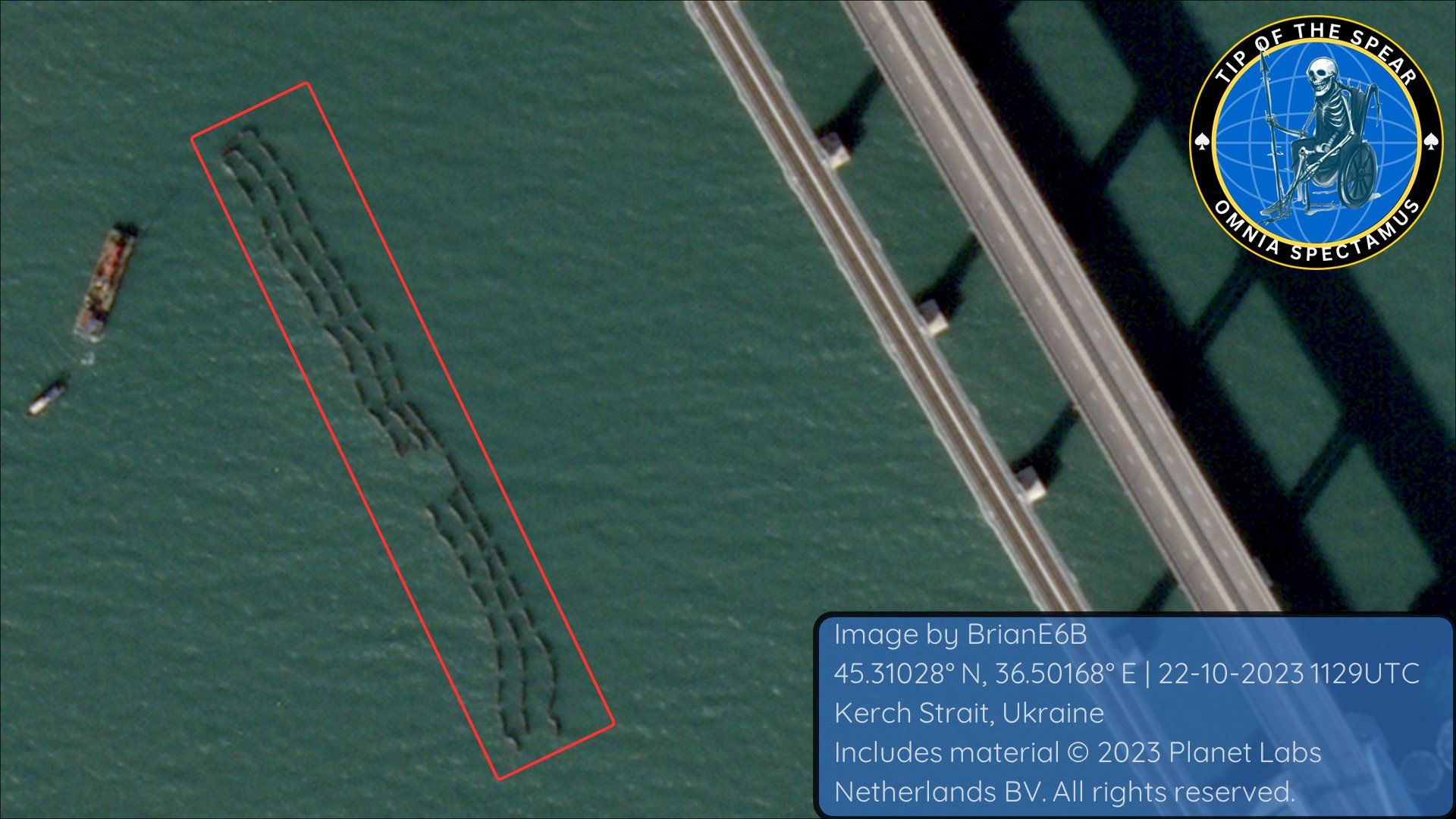 Крім того, аналітик відділу досліджень зовнішньої та оборонної політики Американського інституту підприємництва Бреді Африк також опублікував у мережі актуальні знімки Кримського мосту. На них видно, що бонові загородження могло змити, або ж їх прибрали навмисно. Також на нових супутникових знімках не видно загороджень для бойових дельфінів окупантів.