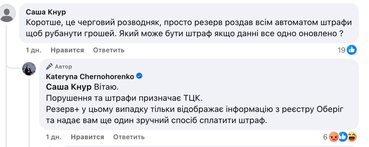 Сененко пояснив, що застосунок бачить лише дату його завантаження і чомусь не бачить даних від ТЦК. Пропозицію сплатити штраф Резерв+ автоматично розсилає усім тим, кого вважає порушником, бо інші дані не підтягуються.