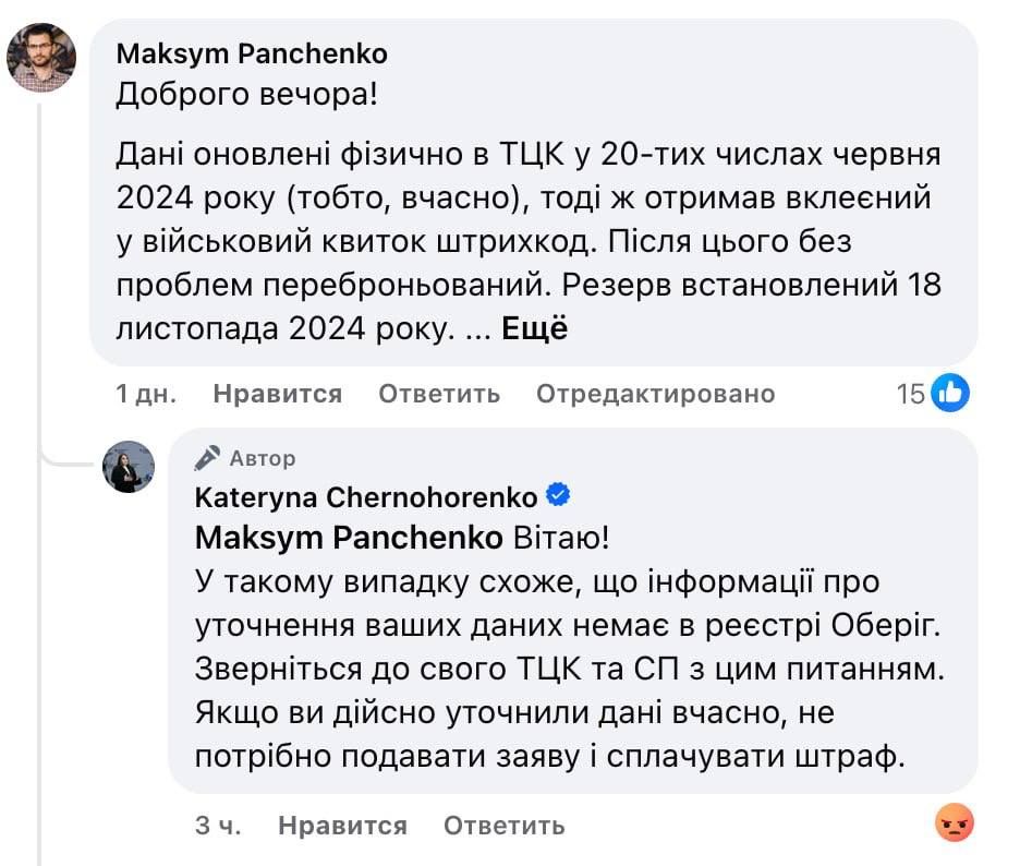 Своєю чергою, на скарги користувачів застосунку відповіла заступниця міністра оборони Катерина Чорногоренко. Вона каже, що інформації про уточнення даних немає в реєстрі "Оберіг" та треба звернутися до ТЦК із цим питанням.