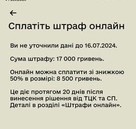 За останні дні тисячі чоловіків могли отримати в Резерв+ повідомлення про те, що вони не оновили свої дані вчасно (тобто до 16.07.2024 року) і штраф за це порушення складає 17 000 гривень. А далі слідує приписка, що якщо сплатити відразу, то усього 8 500 гривень.